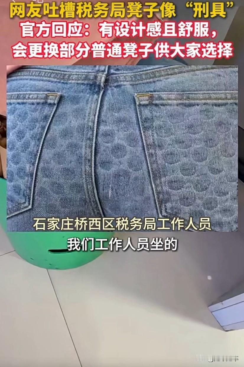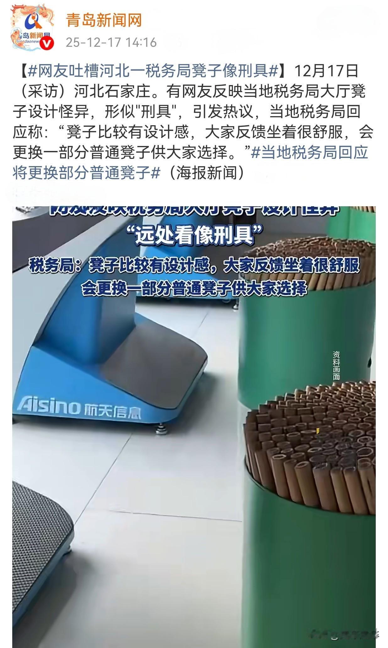 看图一图二你能猜到这是椅子吗?哈哈😄 河北石家庄市桥西区税务局大厅内一批布满密集竹管的凳子,因网友拍摄的竹凳凳面由多根竹管紧密排列组成,视觉上被联想为老虎凳刑具,部分办事群众初次见到吓了一跳。 财务人脑洞让人叹为观止眼界大开。这样的椅子能有什么坏心眼?不过是长得有点[硬核]罢了😂不过说回来这样设计的椅子,在春夏易硌皮肤,衣物可能被竹管间隙夹住哦😲图三 本来凳子的功能是要以舒适度+实用性为主的,公共设施设计更加要注重应兼顾实用,审美与大众接受度,避免因过度追求艺术感导致群众心理不适。 这样个性化的椅子,据说还价值不菲图四。目前该局工作人员回应称,涉事竹凳为早年定做采购,已在办事大厅使用好几年,初衷是为方便长时间等待的群众。目前仍正常使用,将更换一部分普通凳子供大家选择。