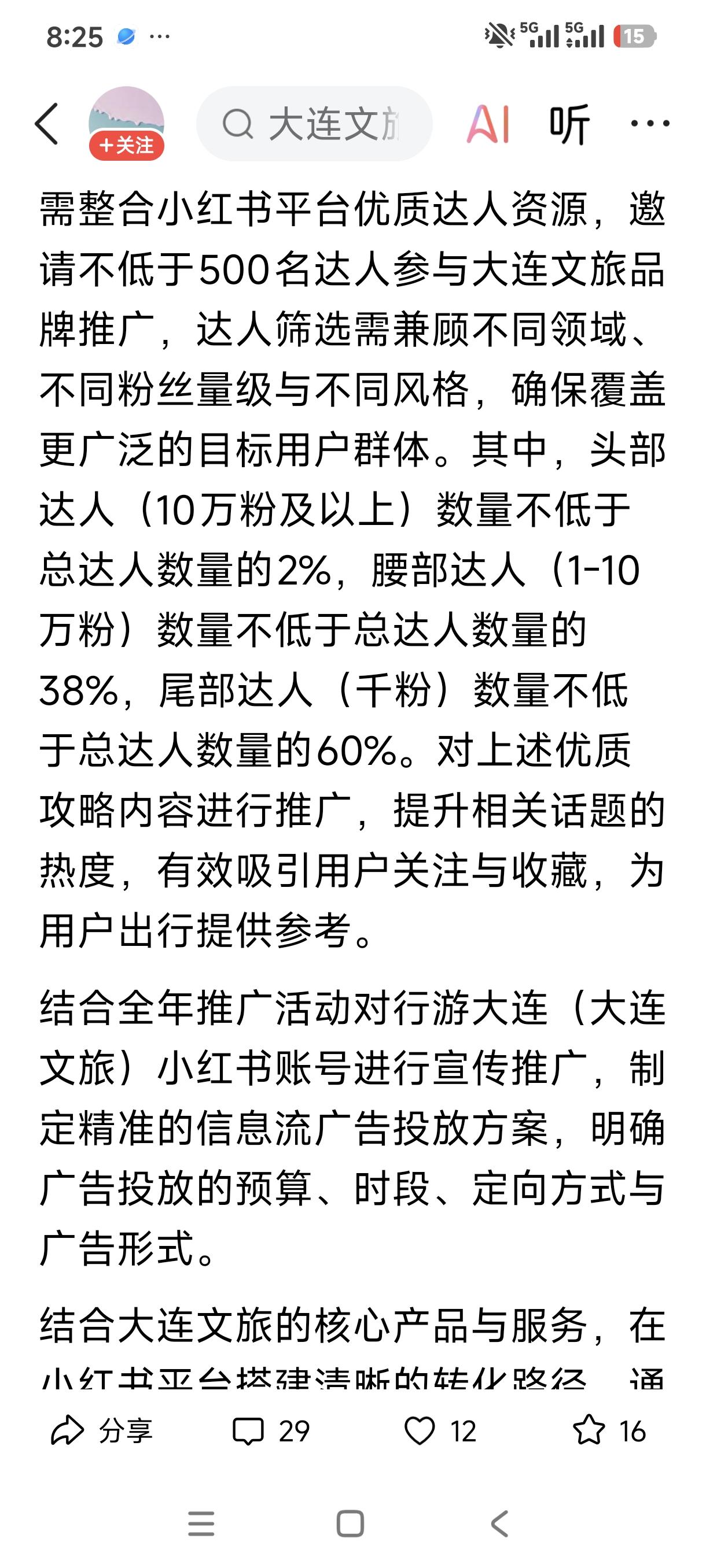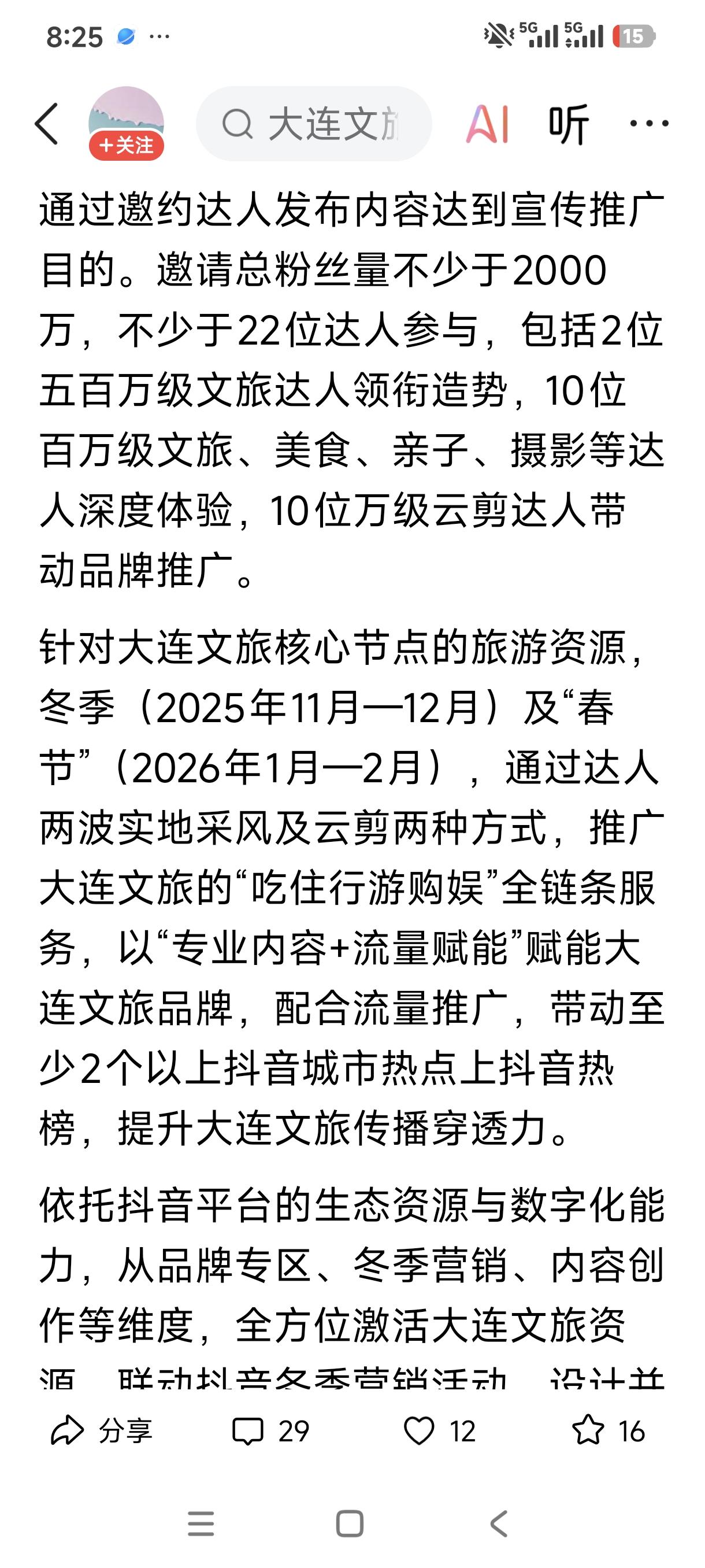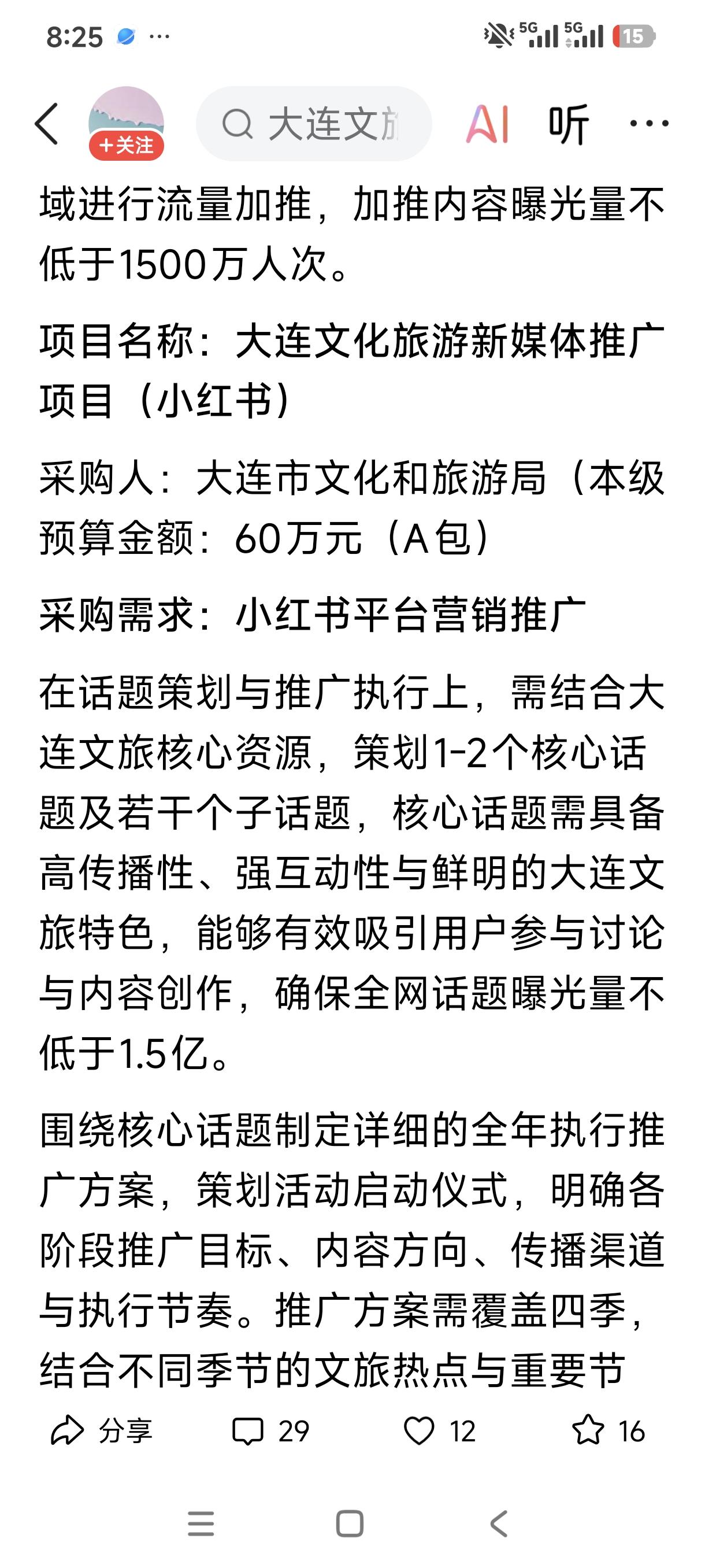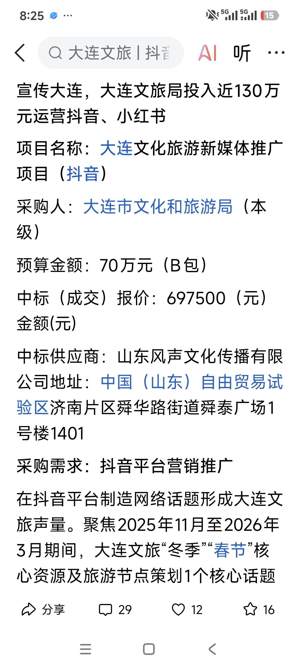 大连动真格要开启文旅宣传新模式!眼瞅着网友铆足劲天天免费给哈尔滨和沈阳宣传文旅,大连再也扛不住,如果不去改变,大连旅游城市被沈阳给超越了! 你看沈阳都是民众自发宣传,都没有啥经费,沈阳几位文旅负责人没事去其他地方露个脸,例如去北京,广州,香港,东京不断的推荐沈阳文旅资源,按照花小钱办大事的原则进行! 这次大连是大手笔70万给了山东风声传媒,60万给了小红书看来这次动真格了,准备策划冬季活动,争取春节都到大连过年,给大连冬季文旅挖掘好,准备在小红书全年宣传,把游客吸引到大连! 这里说明一件事,大连在文旅宣传下功夫有点迟缓,沈阳在5年前就开始大力宣传文旅了,大连因为文旅宣传落后自然现在要迎头赶上,再不努力,就不赶趟了!