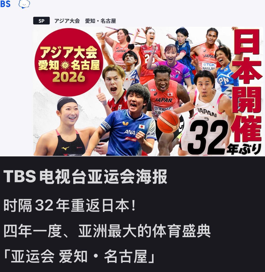 TBS电视台亚运会海报——张本智和站C位 2026年9月20日至28日在 爱知 名古屋举行的四年一届, 亚洲最大的体育盛典, 亚运会,时隔32年,名古屋举行! TBS电视台正式宣布, 将于2026年9月19日—10月4日 全程直播爱之谈名古屋举办的 第20届亚运会! 这是日本自1994年广岛亚运会后 时隔32年,再次承办此项大赛! 不是说乒乓球在日不火吗, 很小众, 还给张本智和这么大的C位? 张本智和的排面给足啦……