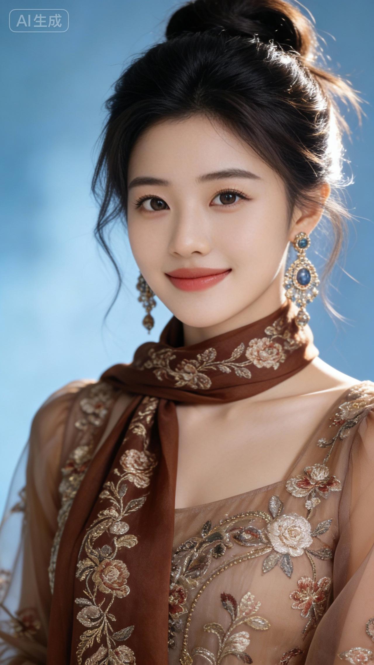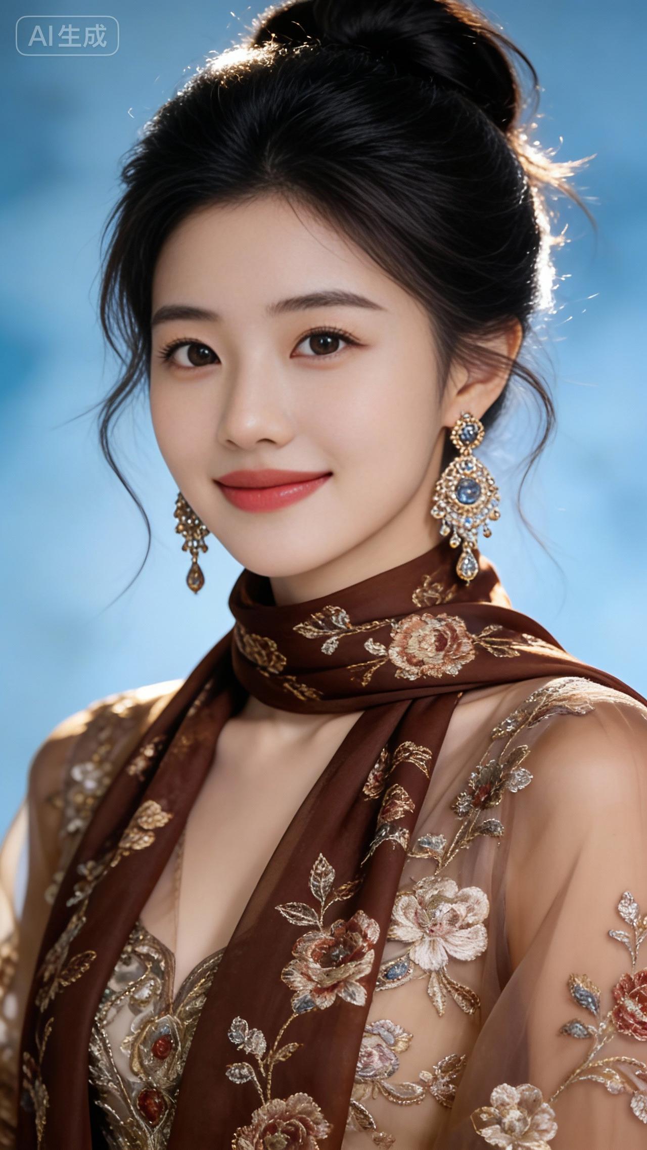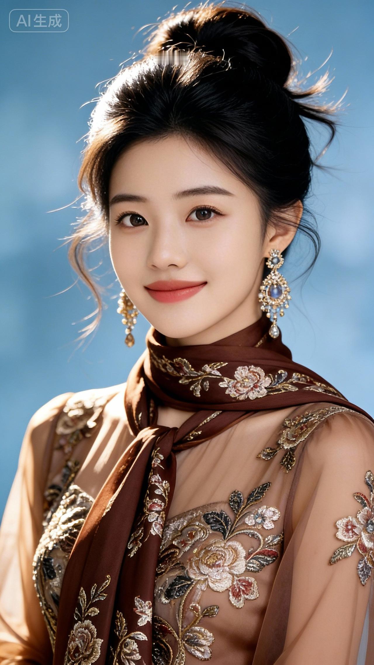 绝色佳人,浓妆艳抹,咖色绣花纱衣服,咖色绣花丝巾柔美,高盘发,微乱,有光感,精致的面容,大眼,睫毛,眼睛高细节