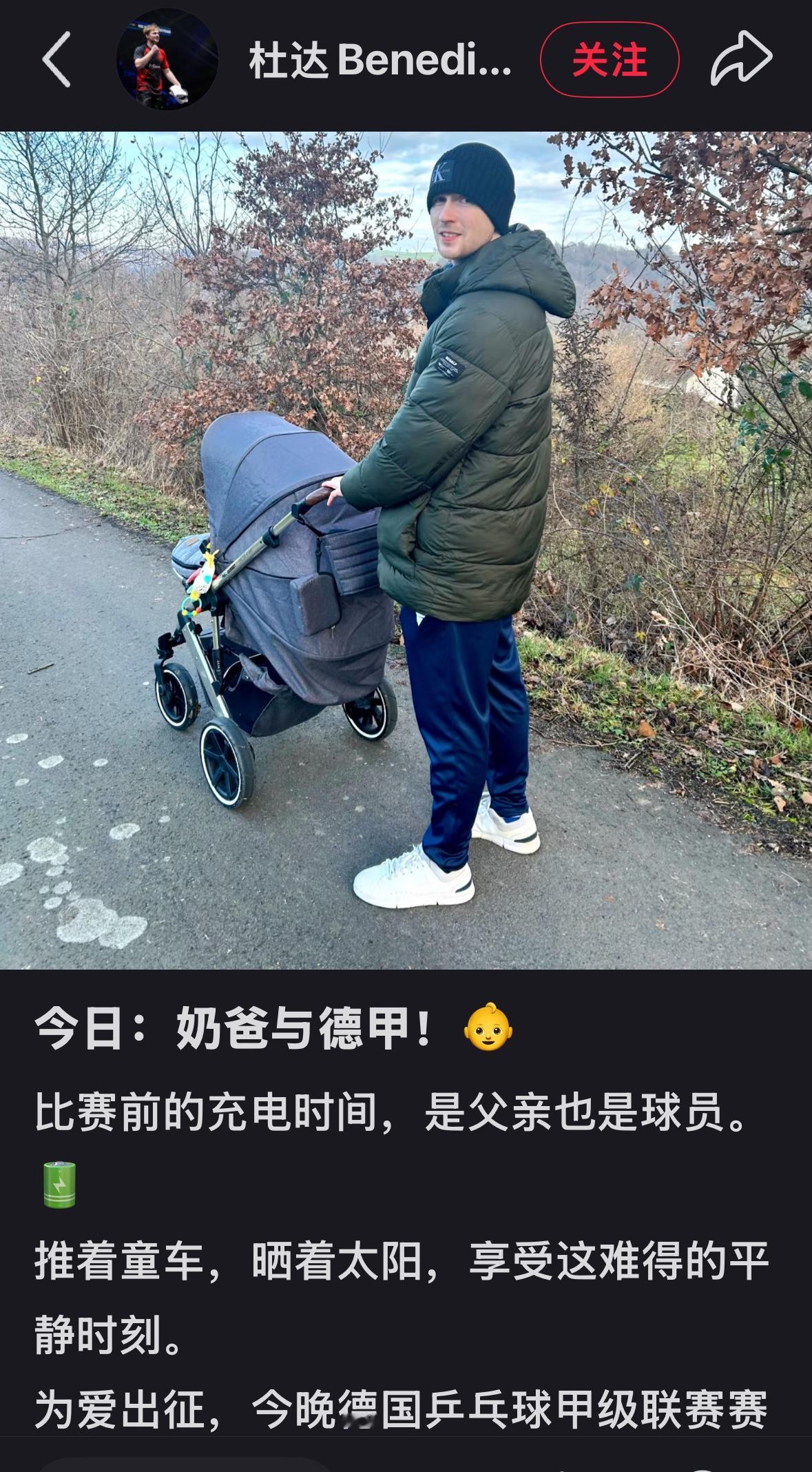 杜达更新:今日的奶爸与德甲! 比赛前的充电时间, 是父亲也是球员, 推着童车, 晒着太阳, 享受这难得的宁静时光, 为爱出征, 今晚德国甲级乒乓球联赛, 赛场见! 超级奶爸, 赛场上输赢尽力而为, 场下永远有幸福的画面, 是球员, 更是幸福的父亲, 为爱拼搏,为爱出征, 赛场,生活都顺利, 加油杜达!