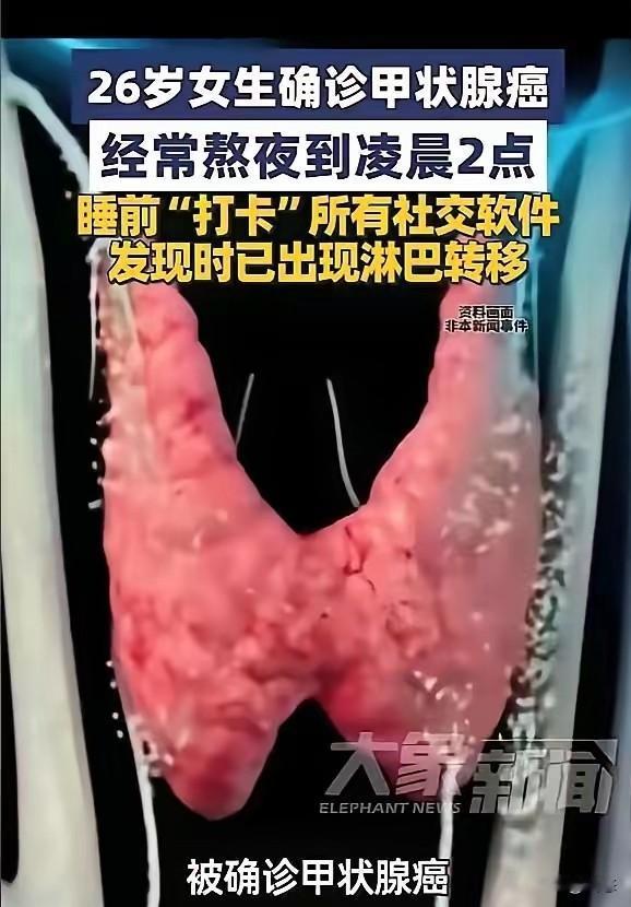 太吓人,一26岁女子经常熬夜到凌晨2点后才睡觉,睡觉之前要把所有的社交软件打卡。女子发现身体不适,去医院检查,没想到被确诊甲状腺癌。 看到这熬夜确实是伤身体,我都深有体会,不知道是不是熬夜造成的。感觉身体免疫力比以前要差多了,冷一下就会感冒那些。 说实话,很多人都知道熬夜对身体不好。开始很多人就是不规律,希望大家还是要注意身体。 熬夜不可取,希望大家引以为戒! 对此你们怎么看呢?多久算熬夜呢?