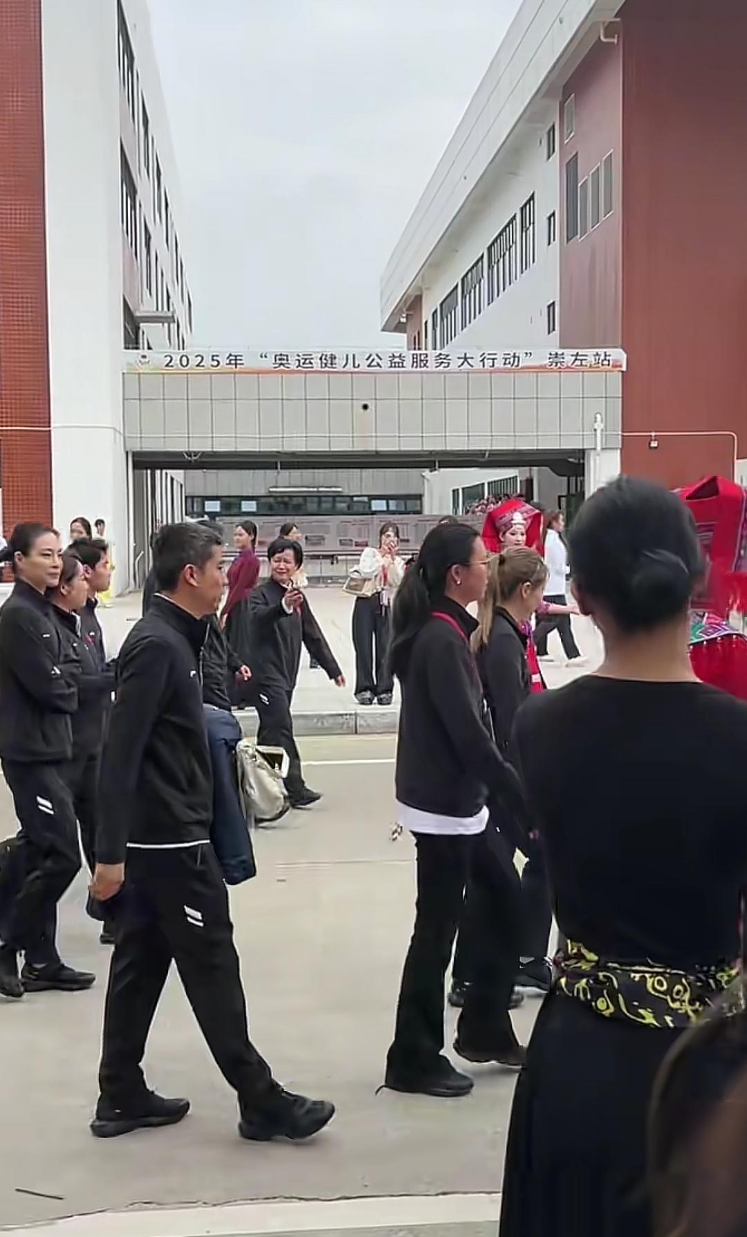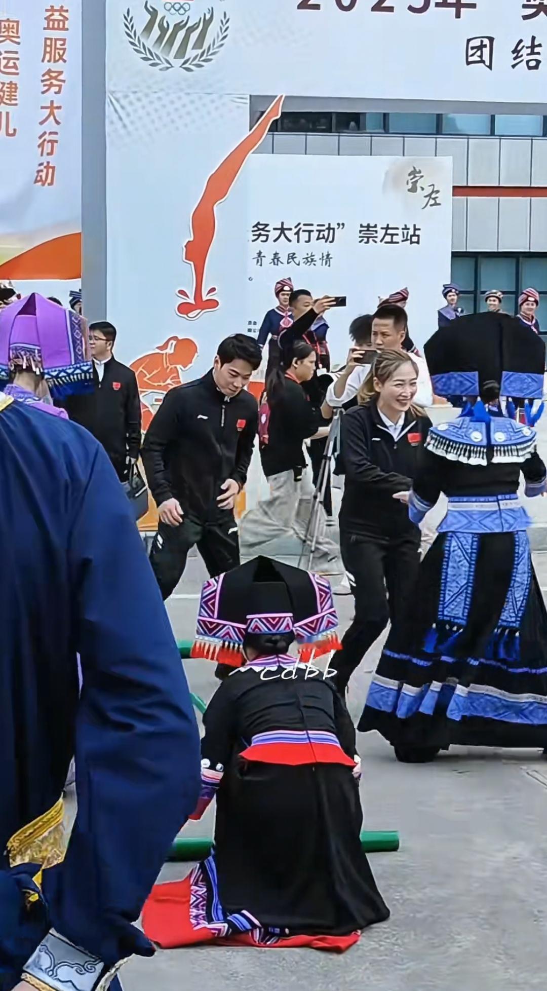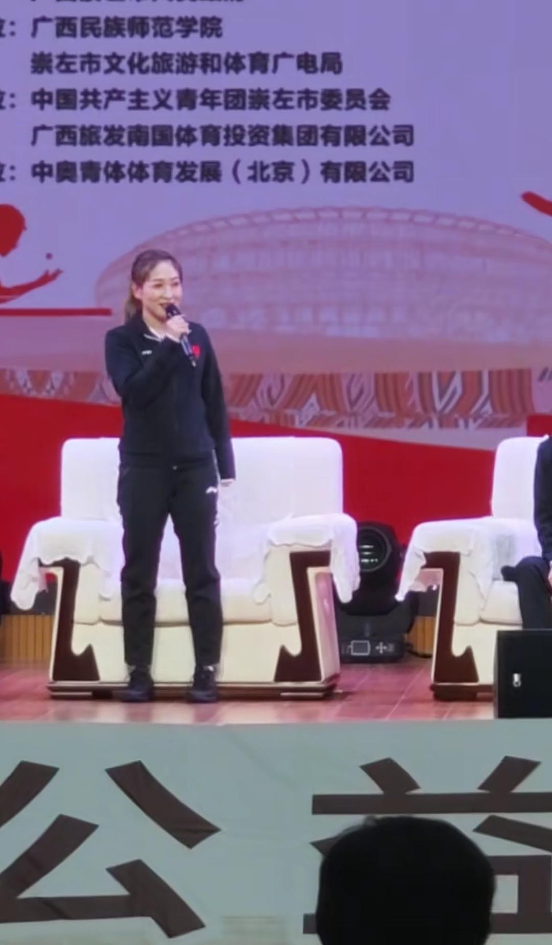 12月17日,刘诗雯和吴敏霞去了广西崇左,来到校园,受到了学校热情接待,这种穿梭校园的活动特别精彩。 刘诗雯和吴敏霞之所以来广西,是来参加“奥运健儿公益服务大行动”崇左站活动,她们一到,同学们在道路两旁进行舞龙表演,还有同学穿着黑色裙子,跳着民族舞欢迎。学校还给奥运健儿们安排了竹竿舞活动。 刘诗雯和吴敏霞在讲台上进行了交流分享,并与大家合影留念,收到了玩偶。
