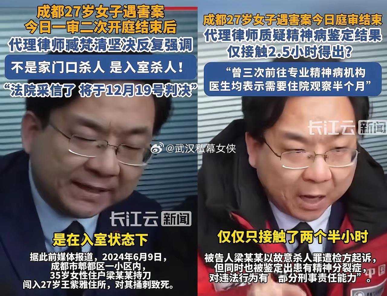 五百多个日夜的煎熬,紫雅妈妈终于要等到法院的宣判了,这次一审的二次开庭,两个新消息让人震惊又愤怒:第一:根本不是家门口杀人,而是入室行凶。紫雅是在家里被梁某滢杀害的,这个性质就更恶劣了。第二:精神病鉴定报告有问题。臧律师和他同事曾三次伪装成精神病人暗访精神病的鉴定流程,得到的结果都是至少要住院观察半个月才行。而梁某滢的鉴定呢,鉴定人员仅和她接触了2.5个小时,后续也没有持续观察,就开具了证明,人命关天的事这么草率,让人细思极恐。真相一点点的被扒开,现在就等法院怎么判了,坐等结果。你们对此事还有哪些看法,欢迎来评论区聊聊~