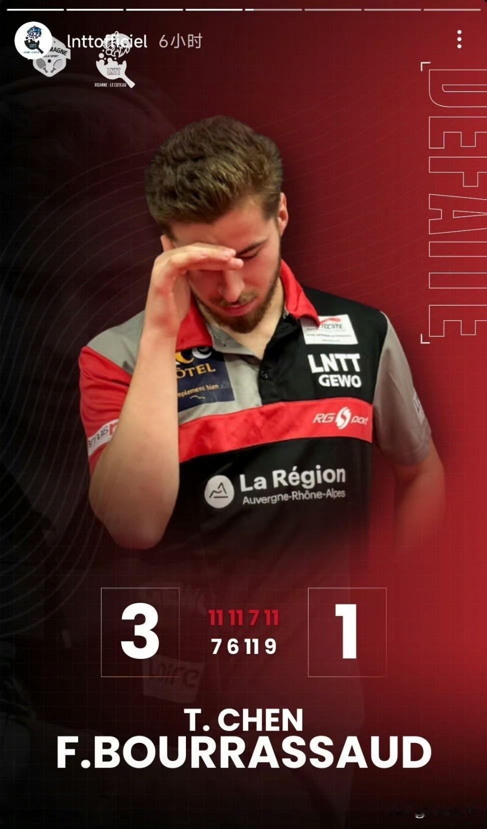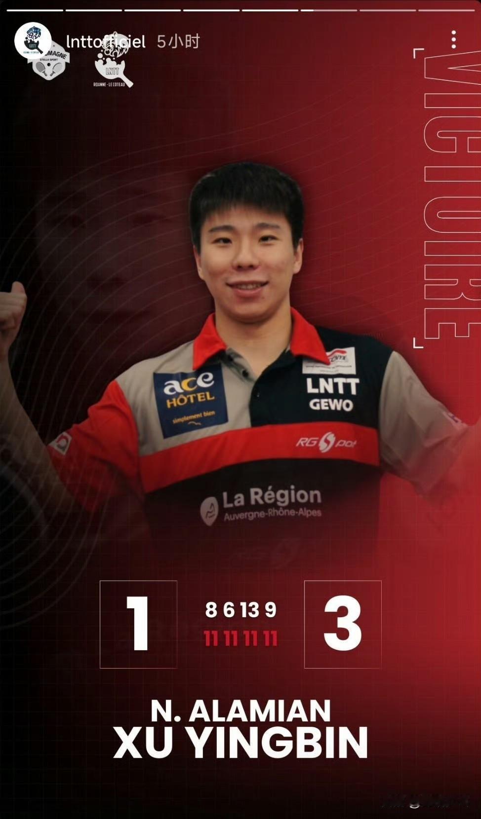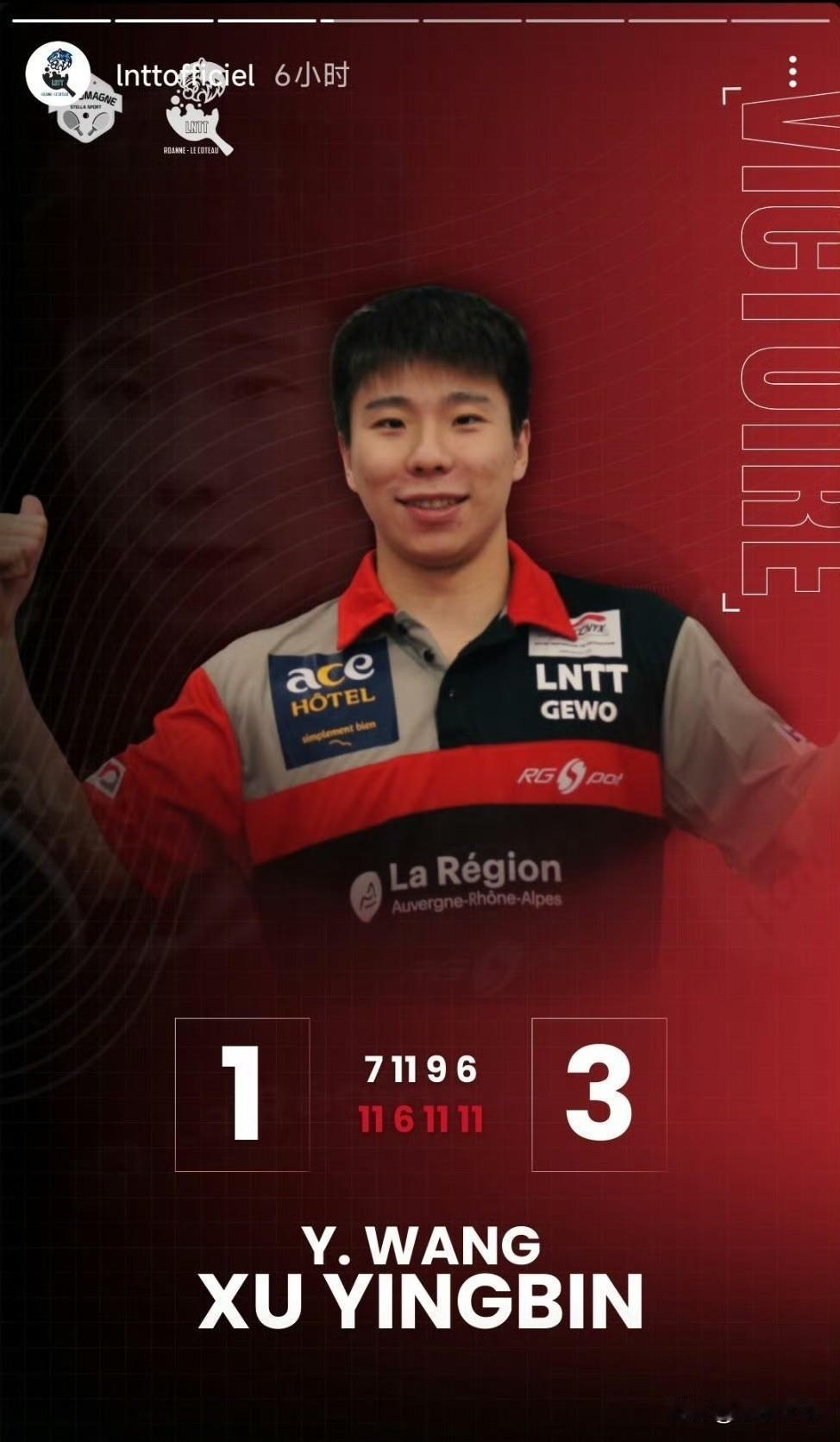 2025-2026赛季法国乒乓球联赛 第七轮:12.17 【罗阿纳3-1罗马涅】 1.拉内福尔3比0阿拉米安(10,8,9) 2.徐瑛彬3比1 Wangyang(7,-6,9,8) 3.布尔拉萨德1比3陈天元(-7,-6,7,-9) 4.徐瑛彬3比1阿拉米安(8,6,-11,9)