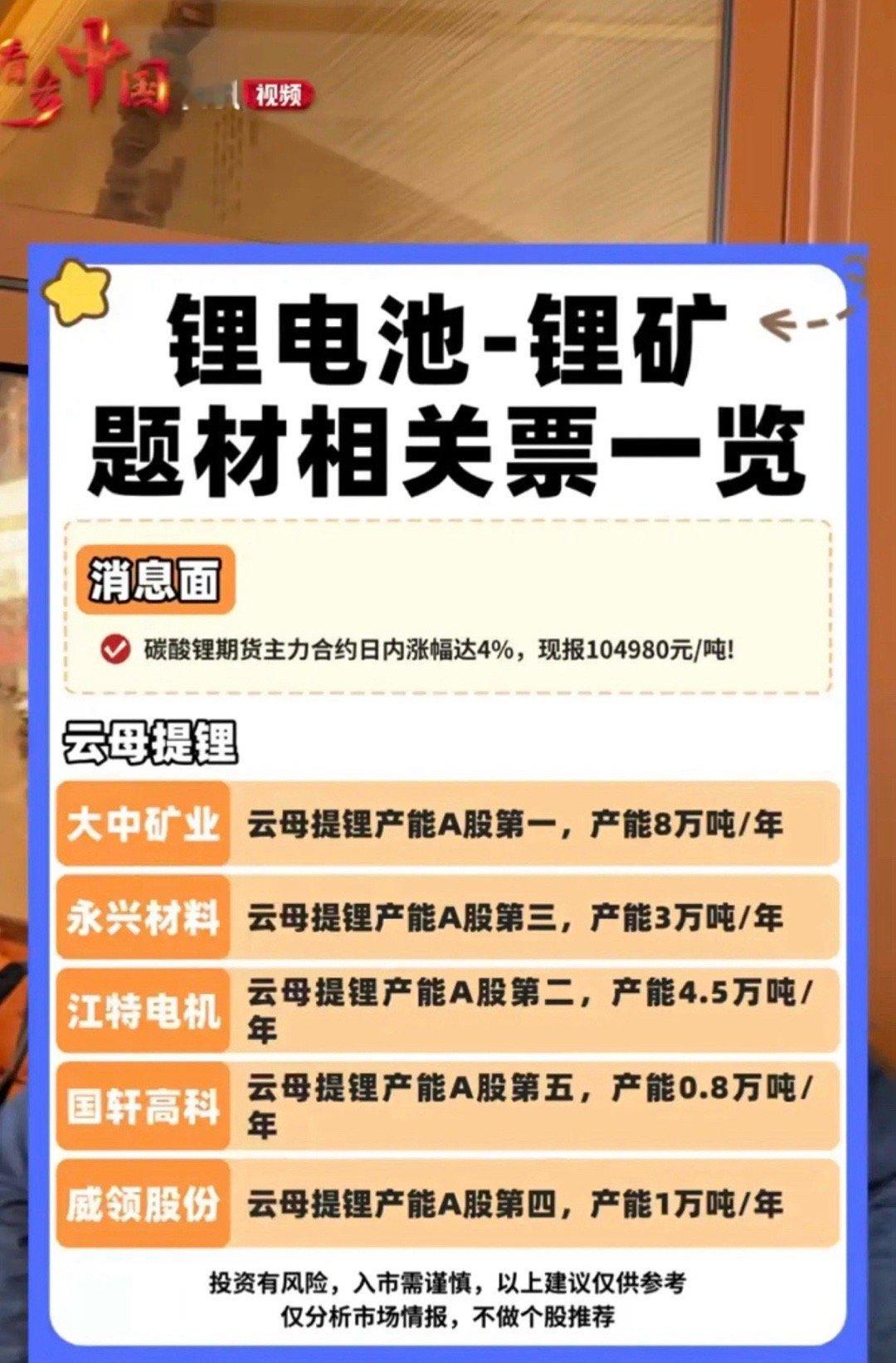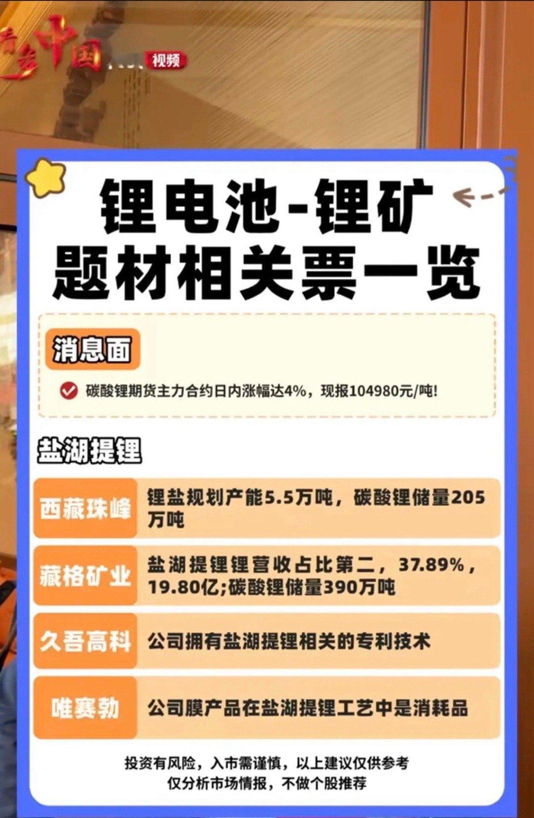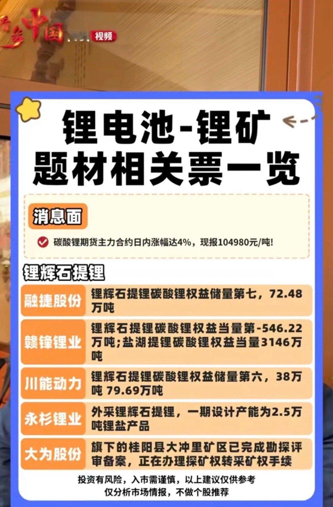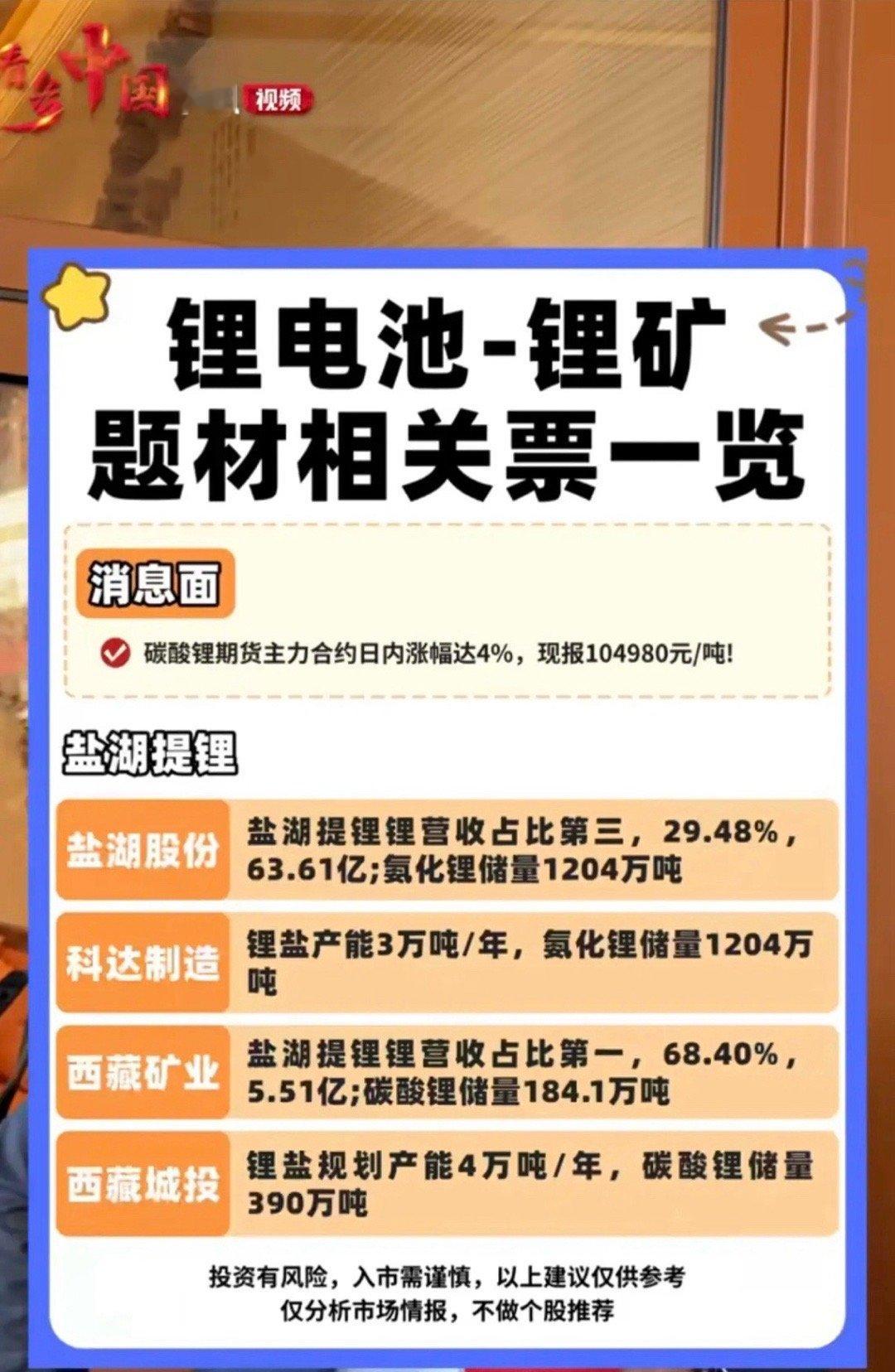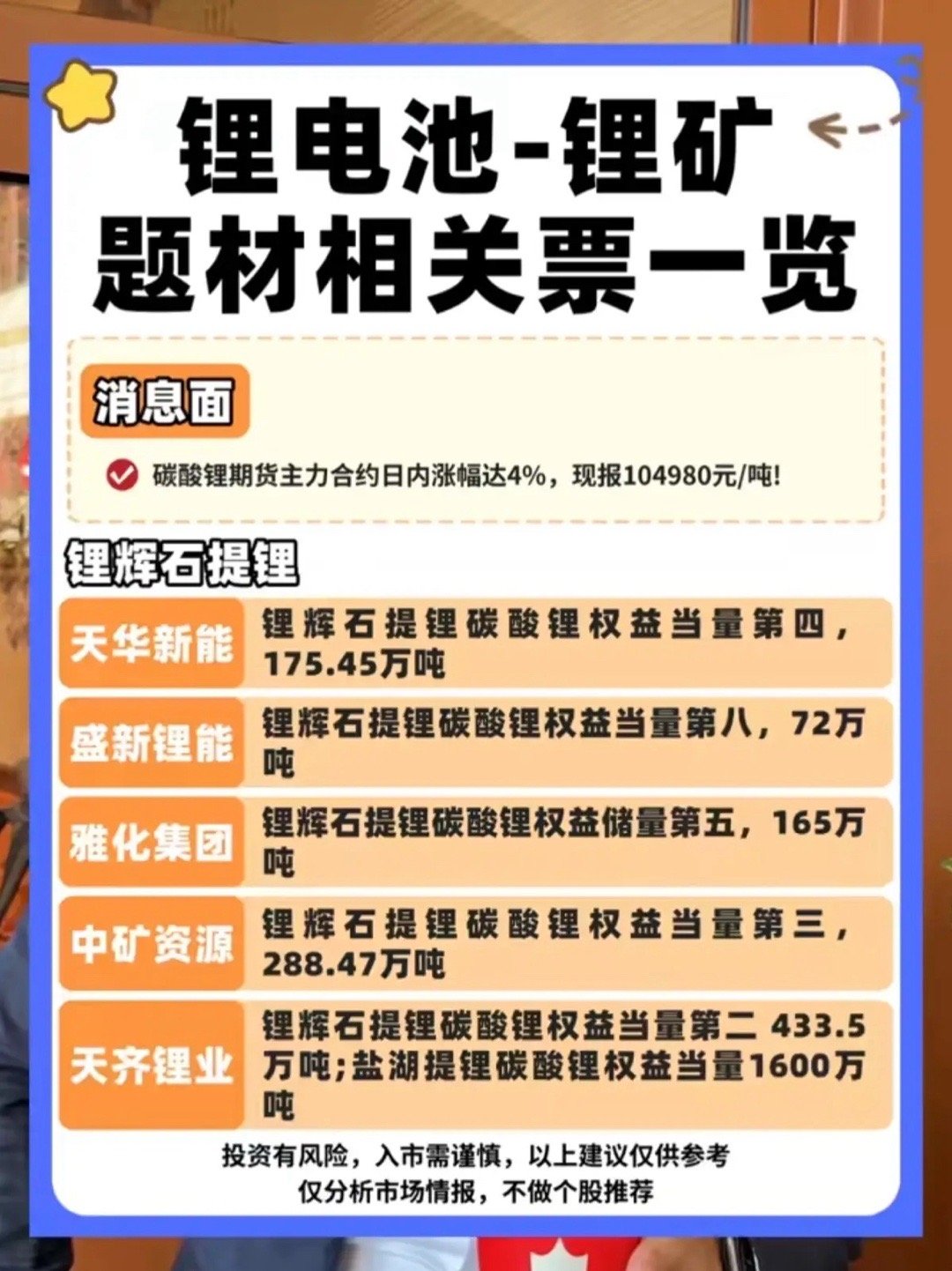 锂电池-锂矿:题材相关票一览!碳酸锂期货主力合约日内涨幅达4%,现报104980元/吨!相关核心龙头股(含矿储量,产能)、