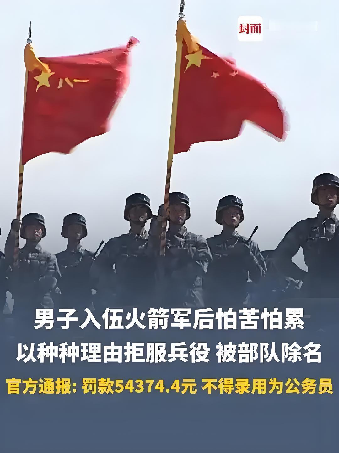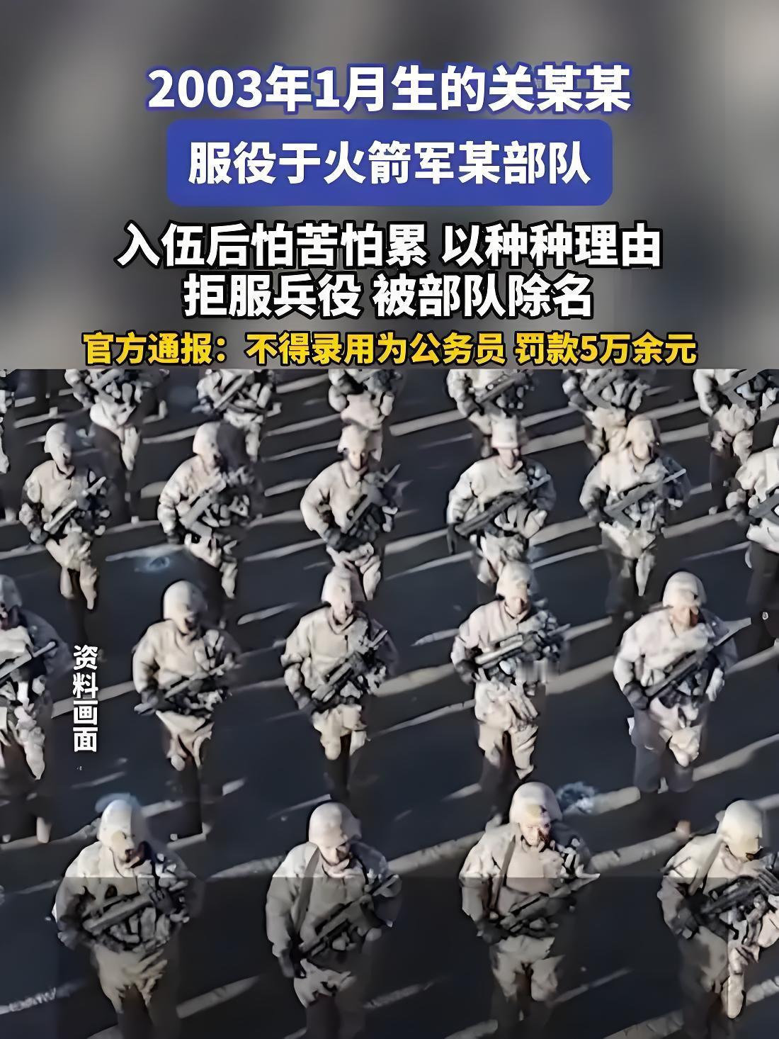 拒服兵役终受惩!火箭军新兵因怕苦怕累遭除名,官方通报敲响警钟 “保卫祖国、抵抗侵略是每个公民的神圣职责”,这不仅是《中华人民共和国兵役法》的明确规定,更是刻在国人心中的责任担当。然而近日,云南省曲靖市麒麟区征兵办的一则通报,却揭露了一起令人警醒的拒服兵役事件:22岁男子关某某应征入伍火箭军后,因怕苦怕累、思想消极,执意拒绝履行兵役义务,最终被部队除名并面临多项严厉处罚,用实际案例印证了“服兵役无儿戏,违法失责必严惩”的铁律。 事件的脉络清晰而典型。2003年出生的关某某,2025年9月通过严格的体格检查和政治考核,从曲靖市麒麟区应征入伍,成为火箭军某部队的一名新兵。火箭军作为国之重器的守护者,其训练强度与纪律要求本就高于普通部队,这既是对军人意志的磨砺,也是履行国防使命的必然要求。但关某某入伍后,却难以适应部队的严格管理与训练节奏,思想迅速滑坡,以种种理由逃避服役,多次表达离队意愿。 为挽回这名年轻士兵,部队、区征兵办、镇武装部工作人员及家属轮番开展谈心教育,反复宣讲拒服兵役的政策法规与严重后果,试图唤醒他的责任意识。但无论多方如何苦口婆心,关某某始终态度坚决,拒绝履行兵役义务。2025年11月18日,部队依规对其作出除名处分,这场为期两个月的“劝学”最终以失败告终。 任性拒服兵役,必然要付出沉重代价。根据《中华人民共和国兵役法》《云南省征兵工作条例》等相关规定,麒麟区征兵办对关某某作出六项联合惩戒:处以54374.4元罚款(为当地2025年义务兵家庭优待金的4倍);终身不得录用为公务员或国企、事业单位工作人员;户籍“兵役状况”栏永久备注“拒服兵役”;两年内禁止升学复学、出国(境);纳入履行国防义务严重失信主体名单;通过新闻媒体向社会公开通报,作为反面典型警示他人。这一系列处罚,不仅让关某某的个人发展受限,更让其人生履历留下了难以抹去的污点。 网友们对此纷纷表示“处罚得当”:“军人的天职是服从,怕苦怕累就别入伍”“国防不是儿戏,既然穿上军装,就要扛起责任”“通报就是要让所有人知道,拒服兵役没有退路”。事实上,关某某并非个例,近期河北廊坊的刘某、河南开封的张家豪等新兵,均因拒服兵役受到类似严惩,罚款金额从4万余元到5万余元不等,且都面临就业、升学、信用等多方面的限制。这些案例共同传递出一个明确信号:服兵役是公民的法定义务,任何以“怕苦怕累”“不适应”为由拒绝履行义务的行为,都将受到法律的严惩。