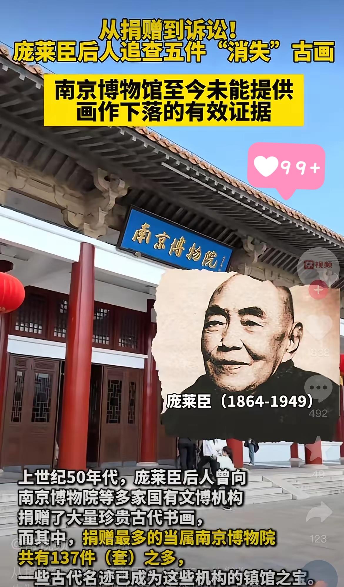 8800万,一下就把三代人的信任打碎了 庞家人当年把137件传家宝捐给南京博物院,想的是文脉永存,信的是国家机构。 谁能想到 70 多年后,这批国宝级文物的价值,竟被轻飘飘估值 8800 万元。这个数字,寒的不只是庞家后人的心,更是无数默默为文物保护出力的百姓的心。 这批文物可不是普通藏品。里面有清代画家王翚的山水真迹,有明代文徵明的书法手卷,件件都是经过专家认证的馆藏级珍品。单拿出一件,在拍卖会上都能拍出天价。 南京博物院给出的估值依据,始终没有对外公开。是按文物的材质算,还是按市场行情定?老百姓不知道,庞家后人也没得到一个明确的说法。 要知道当年庞家人捐文物的时候,一分钱没要。他们抱着的是“物归国家,代代相传”的朴素想法,宁愿自己守着清贫,也要让国宝有个安稳的家。 现在这个 8800 万的估值,更像一盆冷水。它把“无偿捐赠”的情怀,换算成了冷冰冰的数字,还把这份情怀贬得一文不值。 文物捐赠从来不是单方面的付出。国家机构的公信力,才是老百姓愿意拿出传家宝的底气。一旦这份信任没了,谁还敢把压箱底的宝贝捐出来? 这些年类似的事情不是没有。有的地方博物馆把捐赠文物束之高阁,有的甚至出现了文物损坏、丢失的情况。每一次事件,都是对捐赠者信任的一次消耗。 庞家人要的可能不是钱。他们要的是一个态度,一个对文物价值的尊重,一个对家族无私奉献的认可。这 8800 万,显然给不了这些。 文物是民族的根脉,捐赠者是文脉的守护者。对待守护者的态度,就是对待文化的态度。这笔账,不能只算经济账,更要算人心账。 各位读者你们怎么看?欢迎在评论区讨论。
