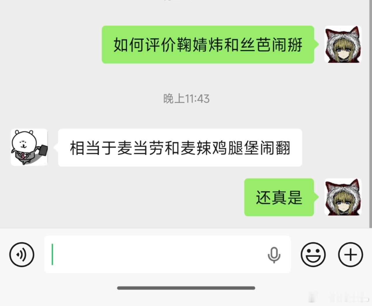 鞠婧炜和丝芭闹掰相当于麦当劳和麦辣鸡腿堡闹掰,大家懂我意思吗?鞠婧祎鞠婧祎丝芭