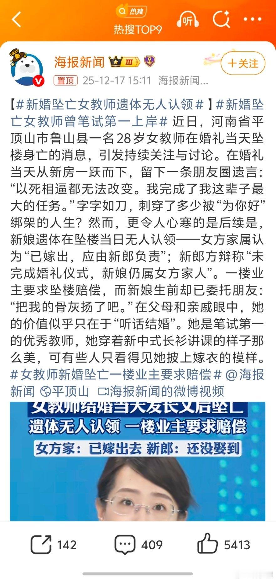 新婚坠亡女教师遗体无人认领这种父母也是世间罕见。大多数催婚的父母,若子女想不开轻生了,也不至于不愿意认领后事吧。不是结不结婚的单一问题,纯纯的毫无人性。这样显得更不值得了,应该不顾一切的逃离。不过,都说性格决定命运,其实有时相反,是命运决定性格。投胎给这种没有人性的父母,长期压制,造成一个失去反抗能力的性格。所以,短剧真的无脑么?可能不见得,一些看似极其夸张的原生父母,只是你我不曾见识,不是没有。适合来个重生剧本。如果知道这样的命途,再来一次,会为自己反抗一次吗?