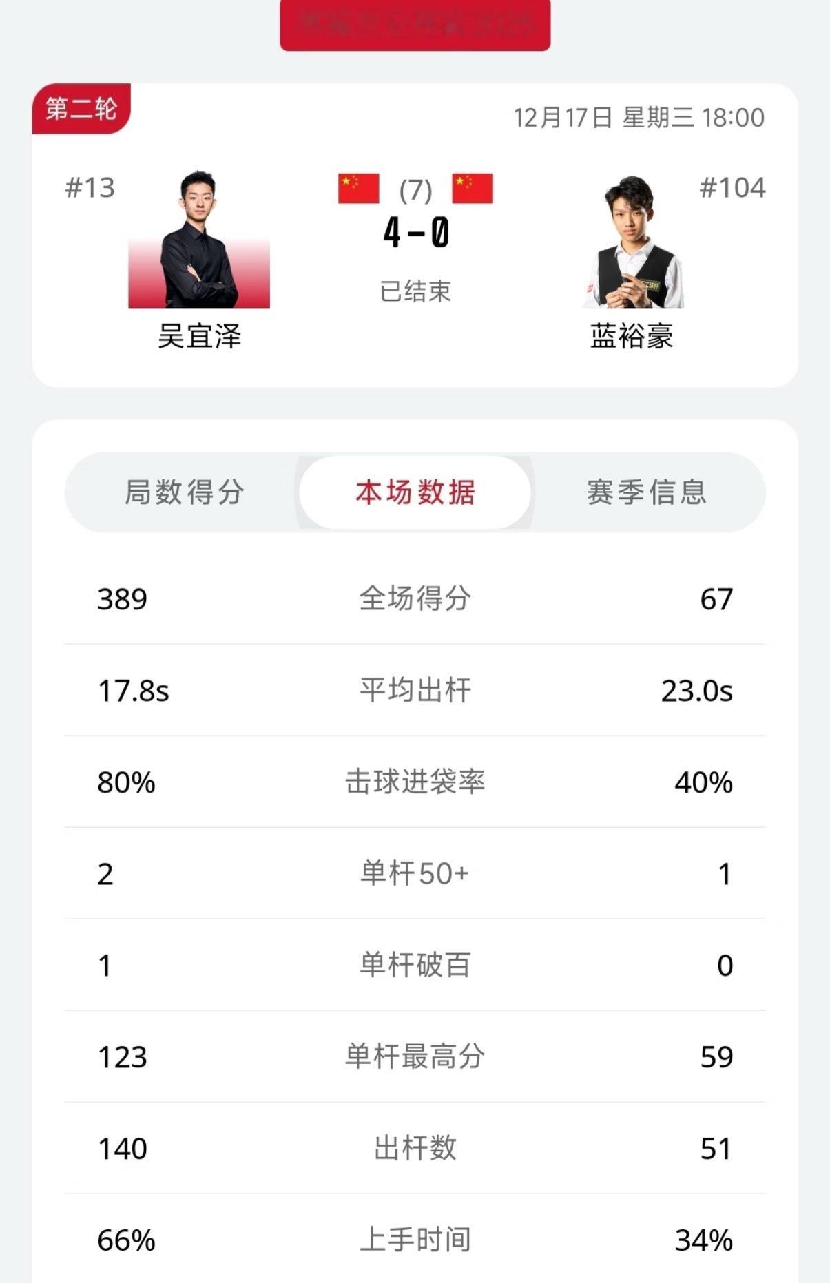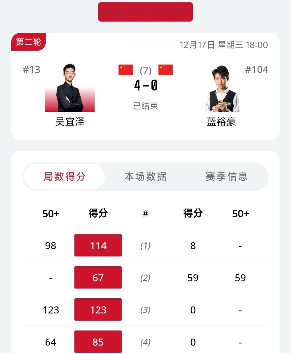 刚刚结束的2025年斯诺克苏格兰公开赛第二轮上演中国德比。国锦赛冠军吴宜泽状态神勇,面对职业赛新人蓝裕豪,他轰出一杆破百和两杆50+,以总比分4比0横扫取胜,强势晋级16强,同时也成为本届赛事首位闯入16强的球员。祝贺吴宜泽!吴宜泽4比0蓝裕豪吴宜泽晋级苏格兰赛16强