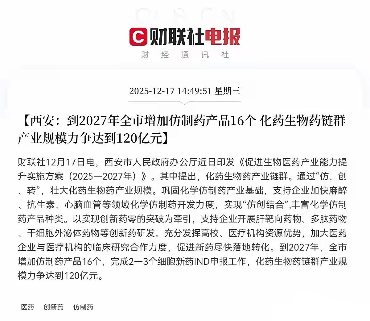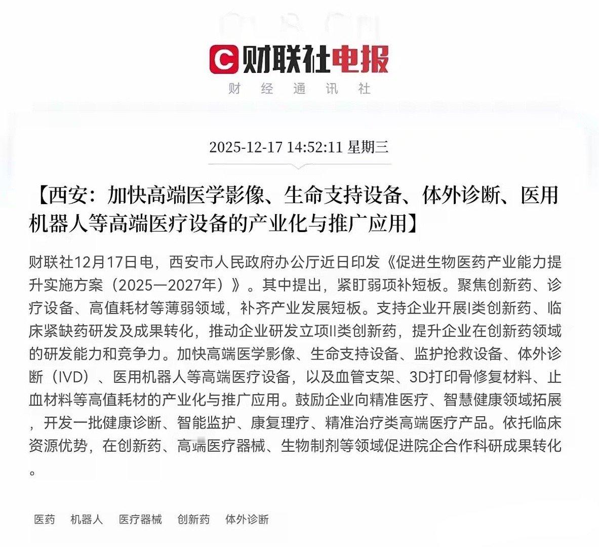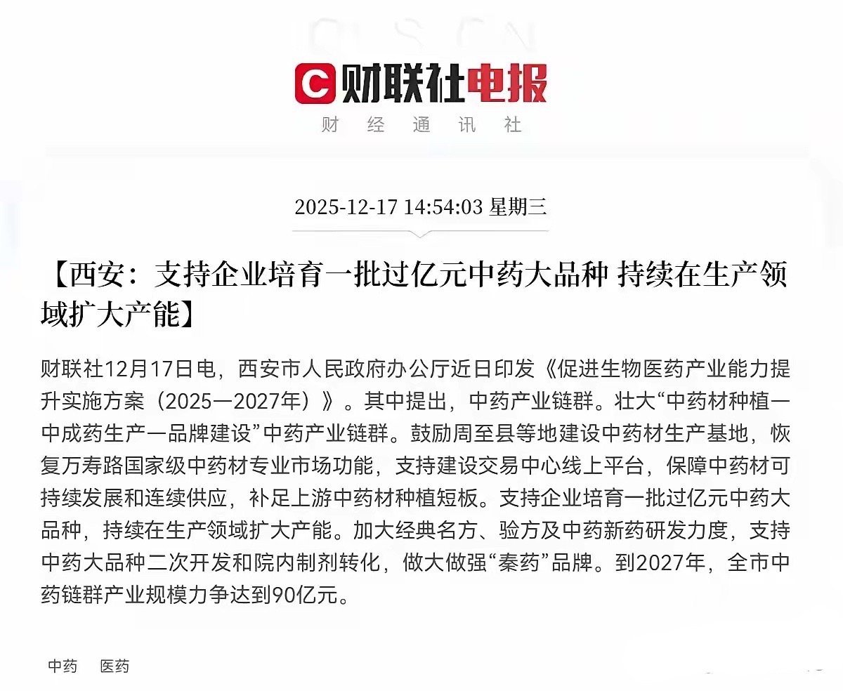 利好来了!利好来了!西安发布重磅利好消息!不出意外的话,明日医药板块有望大爆发了,持有医药股的股民们!此刻估计要乐开花了,终于要轮到医药股了!下午2点50分,西安重磅印发了《促进生物医药产业能力提升实施方案(2025-2027年)》其中重点强调了三点,第一,到2027年全市增加仿制药产品16个,化药生物药链群产业规模力争达到120亿元,第二,支持企业培育一批过亿元中药大品种,持续在生产领域扩大产能,第三,加快高端医学影像,生命支持设备,体外诊断,医用机器人等高端医疗设备的产业化与推广应用,这个消息一出,重仓医药的朋友们高兴的都跳起来了,显然这对于医药产业是大利好,西安这一方案对医药板块的影响是积极、正面的,短期来看有望提振市场对西安本地医药股的关注度和投资情绪, 中长期将有利于助推西安在创新中药、高端医疗器械、CXO等特色领域形成产业集群优势,培育出新的龙头企业,并吸引全国产业链资源聚集,这对于整个医药产业链都是重大利好!股民们!坐稳扶好!受此利好消息刺激,预计明日医药板块有望高开高走了,尤其是西安本地医药股要起飞了!