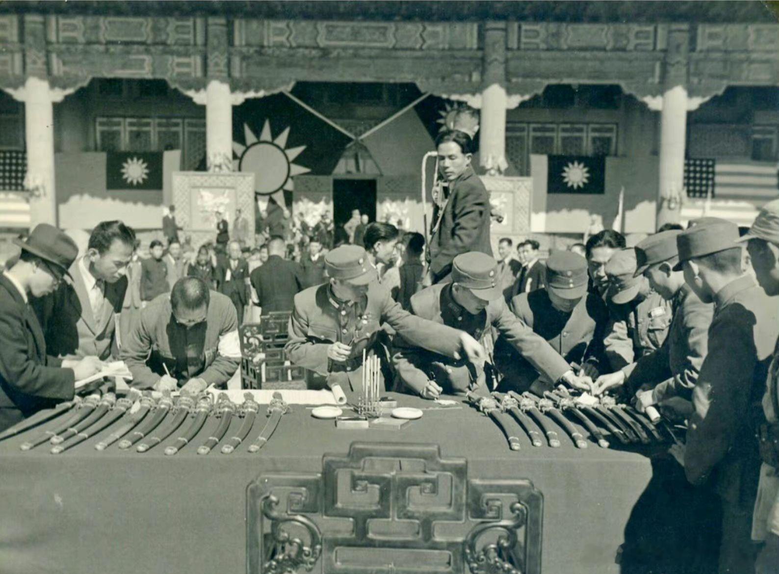 1945年,北平故宫太和殿受降仪式,中方官员清点收缴的日寇军刀。