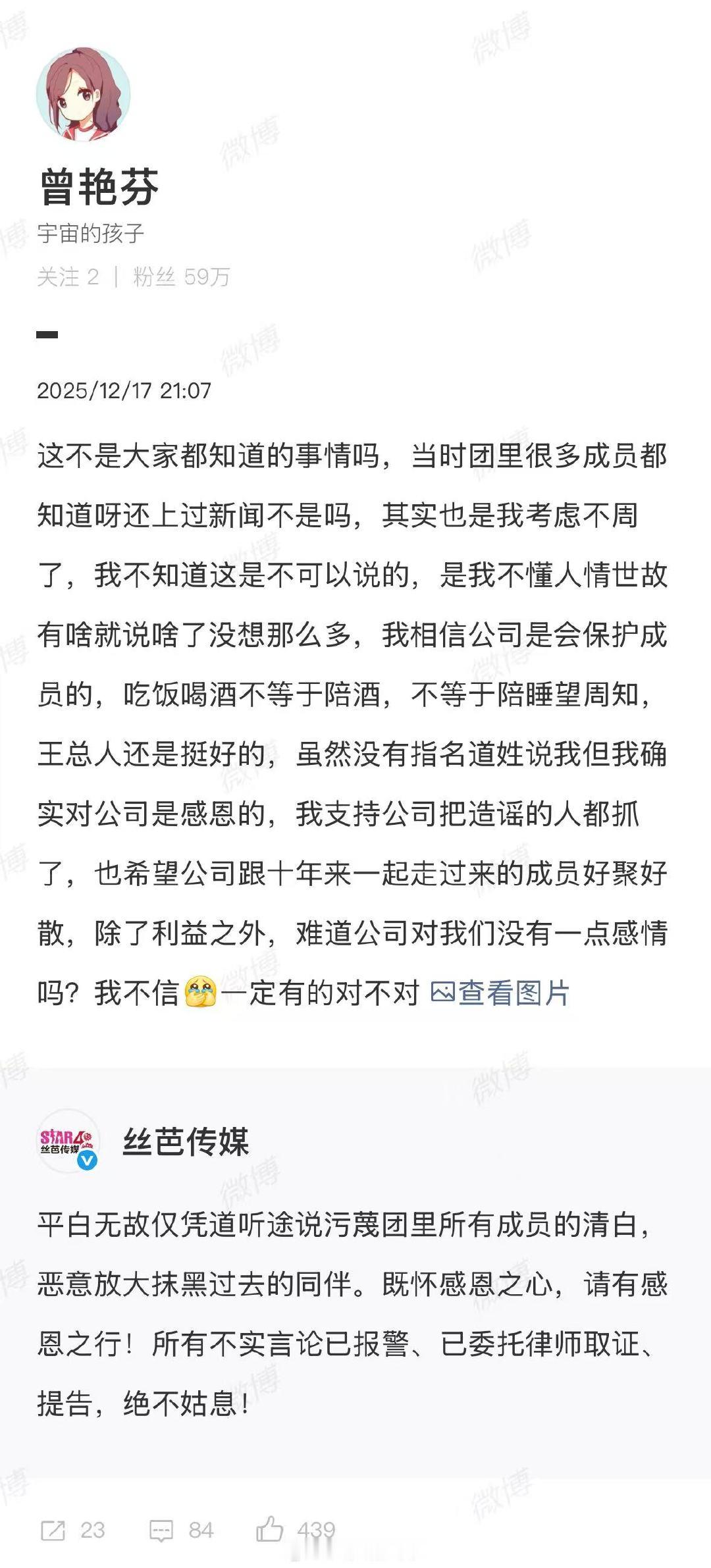 【曾艳芬回应丝芭传媒】曾艳芬说不知道这是不可以说的12月17日,发文称,平白无故仅凭道听途说污蔑团里所有成员的清白,恶意放大抹黑过去的同伴。既怀感恩之心,请有感恩之行!所有不实言论已报警、已委托律师取证、提告,绝不姑息!刚刚,曾艳芬转发该博文回应称:“这不是大家都知道的事情吗,当时团里很多成员都知道呀还上过新闻不是吗,其实也是我考虑不周了,我不知道这是不可以说的,是我不懂人情世故有啥就说啥了没想那么多,我相信公司是会保护成员的,吃饭喝酒不等于陪酒,不等于陪睡望周知。”