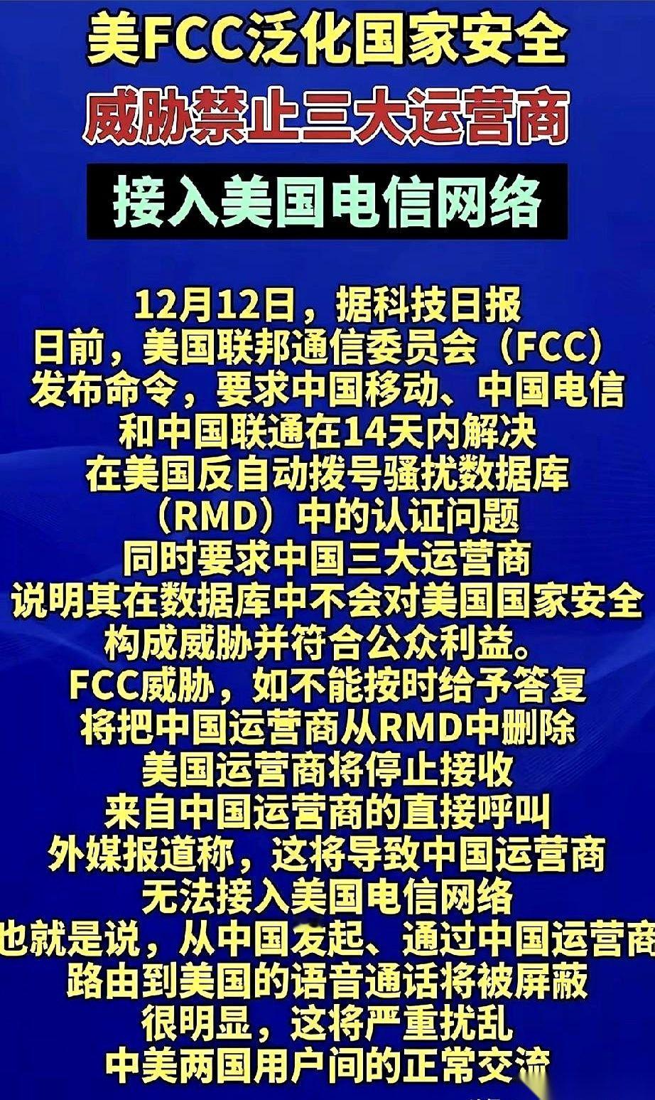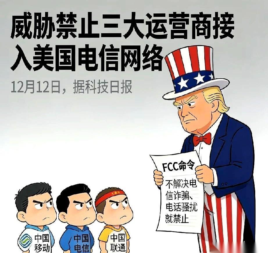就差直接把“我要搞你”四个字写脸上了。 找的理由是什么?说我们的话费套餐里,骚扰电话和垃圾短信太多。 限你14天内解决,不然就断了你在美国那边的网。 听着是不是特别可笑?像不像班上那个学习不行、块头最大的同学,过来找茬说“你呼吸声太大影响我了”。 咱们这边运营商的回复,也直接,也硬气。 潜台词翻译一下就是:大哥,你在教我做事啊?我在自己家地盘上一直就是这么干的,现在为了去你家串个门,就得把家里规矩全改了?那我回头怎么跟家里人交代? 这事儿,明眼人一看就明白。 哪是什么骚扰电话的事儿。 说白了,就是看你家院子修得越来越漂亮,池塘里的鱼也越养越大,挡着他看风景了,心里不舒坦。 就开始想方设法给你家门口泼脏水,堵你家下水道,让你不得安生。 这点小风小浪,真不算啥。 你来我往的牌桌上,谁手里还没几张王牌了? 想靠这种上不了台面的小动作就让我们趴下? 以前没成功过,以后,更不可能。