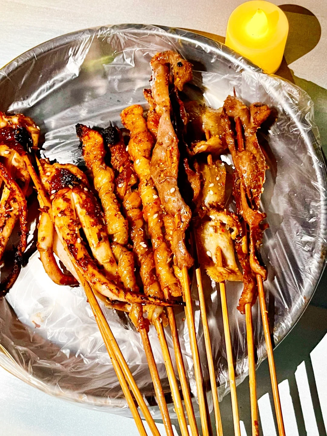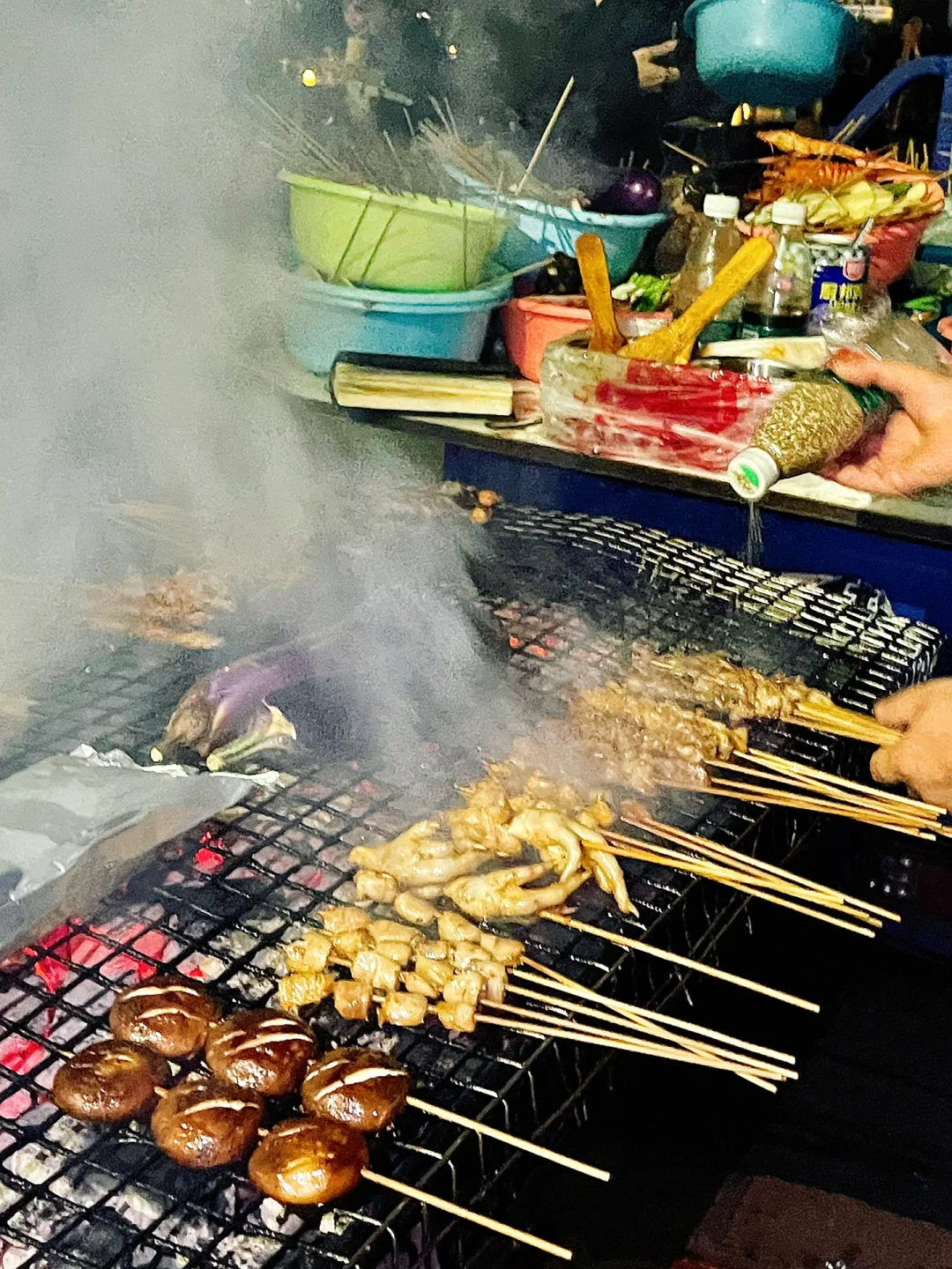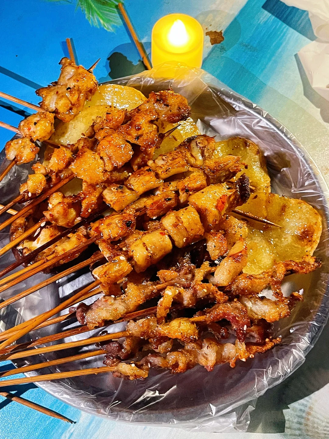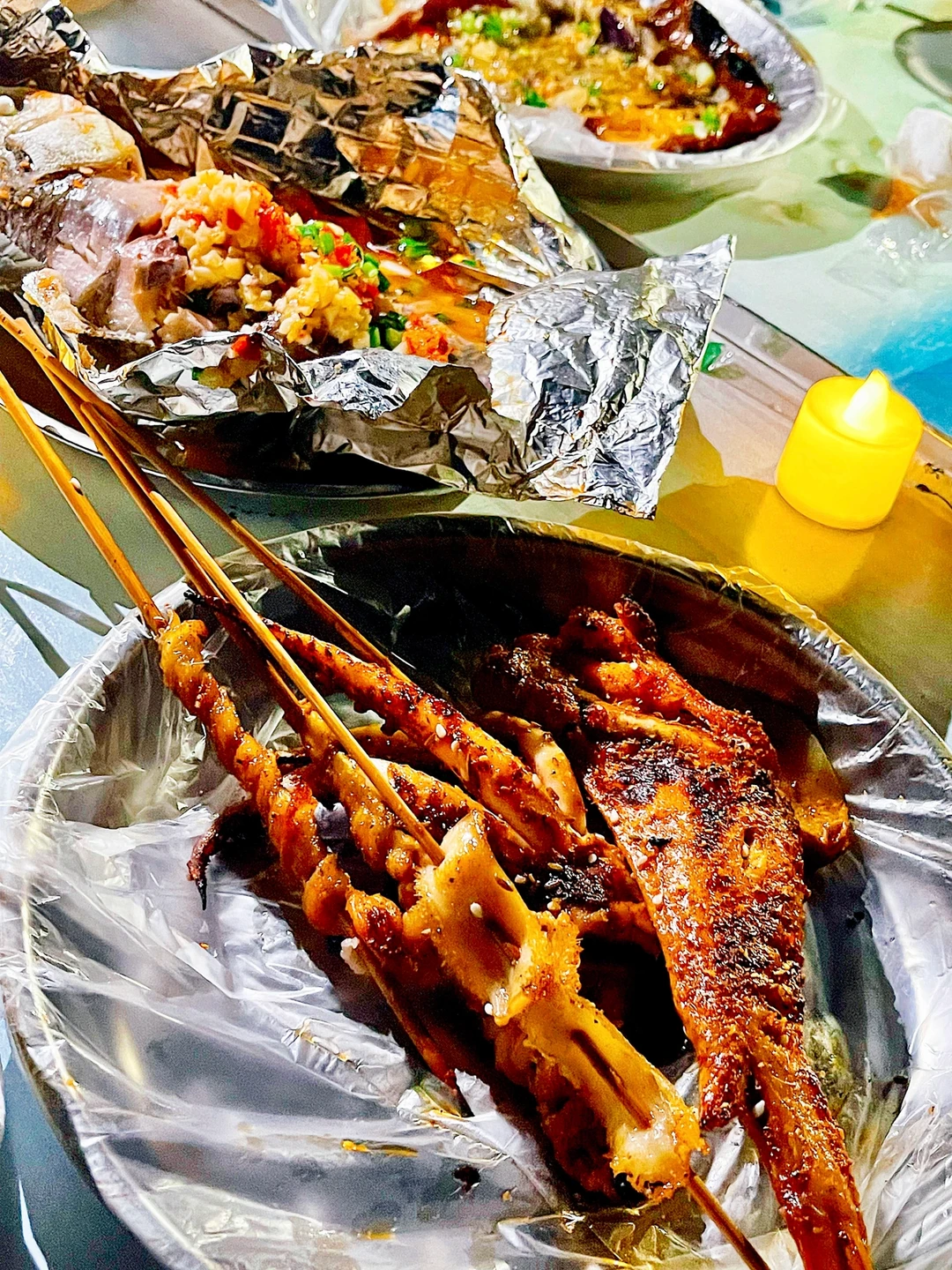 ✨走近看到老板在大树下兢兢业业的烤着各种食物,隔壁还有一个记单小哥和辅助烧烤的小哥😎在小推车上点了一堆我们想吃的串儿,就找了个位置坐下来💛因为人真的太多了,我们等了大概40分钟以上才吃上,没有耐心的朋友慎重前往咯~真的等得我们花儿都谢了🥹终于听到点单小哥说“16号在哪里坐呢。”