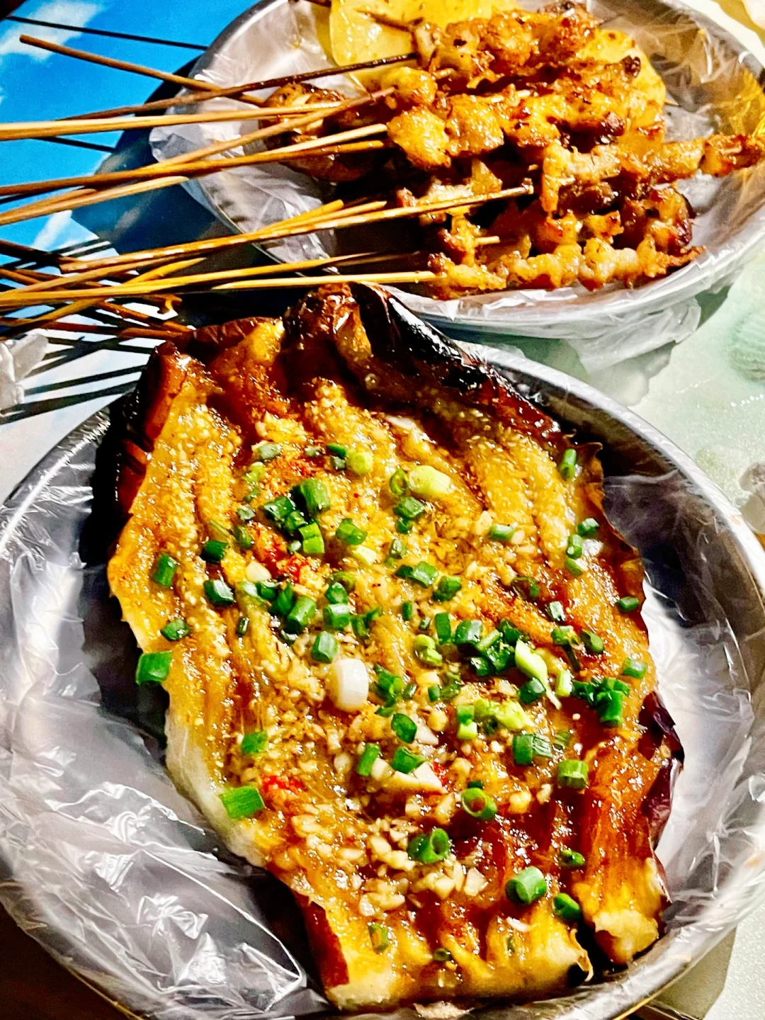 ⭐️他家的烧烤味道是偏咸口味道很足,我很喜欢😍觉得比较有记忆点的是又脆又香的鸡脆骨、不油带着焦香的鸡皮和锡纸鲫鱼,锡纸鲫鱼里面有好多的鱼刺,但是不妨碍它的鱼肉吃起来又酸又香又甜。