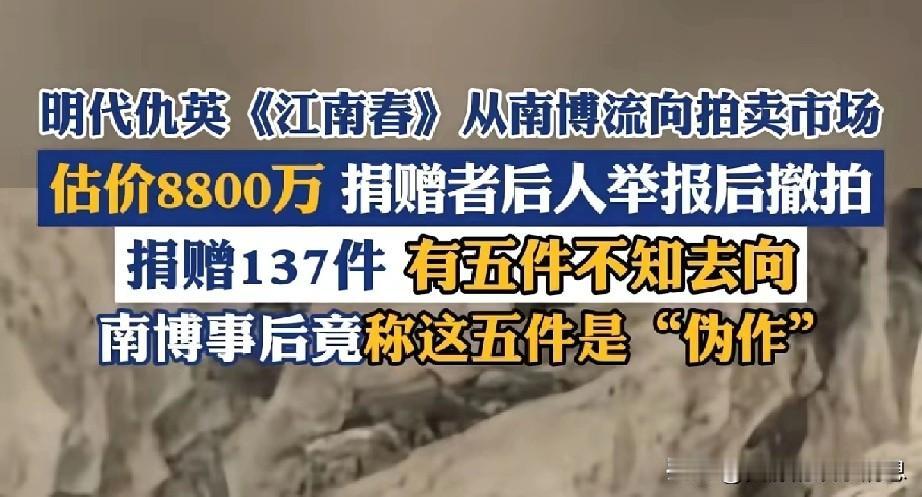 8800万,这个数字让庞家三代人对某些机构的信任彻底破裂。 原本庞家三代人很相信这些机构的,他们曾经捐赠了137件传家宝,表示“希望文脉永存,不愿散失,不愿买卖,不愿藏于私室。” 让人痛心的是现在他们的仇英《江南春》却出现在拍卖行,估价几千万。更让人匪夷所思的是,庞家老二庞孝常为此画作的捐赠出资人根本不知情。要不是媒体报道,庞家根本不知道《江南春》在拍卖行。 要知道,庞家三代人捐赠137件传家宝给大博物馆,目的就是希望国家机构能够妥善保管,不想他们的仇英《江南春》竟然被博物馆“保管”成这样。大博物馆的这“保管”行为,让庞家三代人对国家机构的信任产生了裂痕,这样也会让大家捐赠的热情消失。