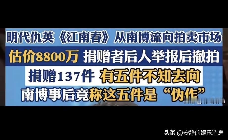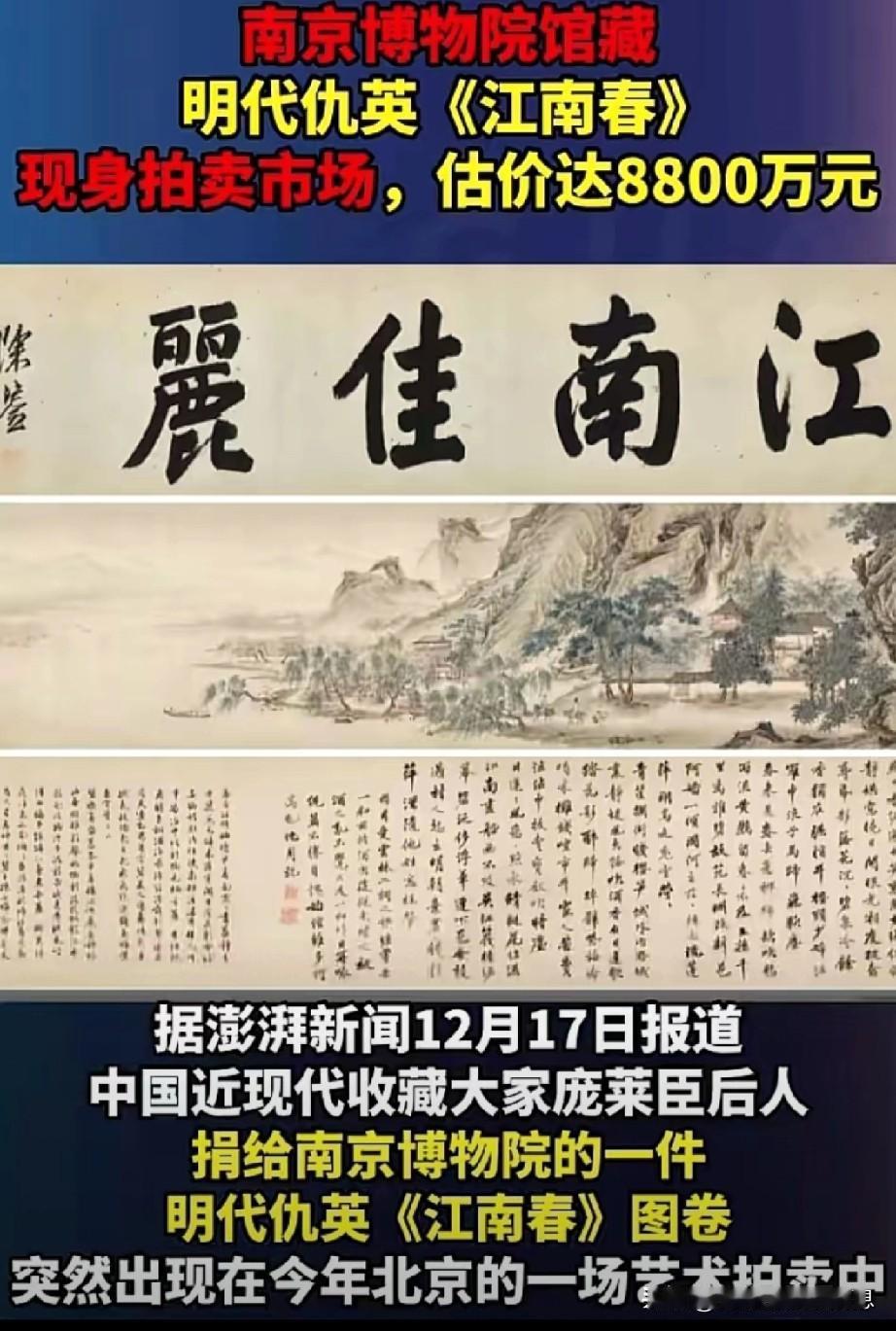 名人仇英的《江南春》图卷,一直以来都被庞莱臣所藏,原本应该是庞家世代相传的珍贵文物,然而在1959年庞家无偿捐赠给南京博物院137件古书画后,这幅图卷便一直在南京博物馆。 谁能想到66年后,庞家在拍卖行中发现了这幅《江南春》图卷,震惊之余赶紧展开调查。这幅图卷被南京博物院收藏了66年之久,从未对外展出,也未告知庞家其收藏情况。 如今,南京博物院面临着巨大的官司与拍卖压力,庞家需要重新梳理捐赠文物的真伪,而南京博物院则需要做好应对一旦失诉的准备。 事情经过是这样的:66年前,庞家捐赠给南京博物院137件古书画,现某拍卖行即将举行的拍卖会中,出现了其中一件著名文物《江南春》图卷,庞家不是震惊于此件文物的估价高达8800万元,而是震惊这幅画为什么会出现在拍卖行。 原来当年庞家捐赠给南京博物院的137件古书画,其中还有5件不知去向。南京博物院称这5件是“伪作”,不知道双方将如何解决眼前的问题?