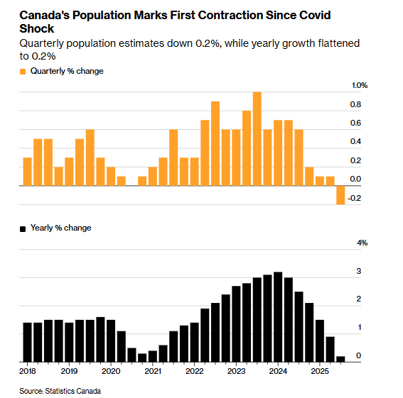 加拿大人口三季度出现下降,留学生等临时居民大幅减少,但永久居民增长持平加拿大 据彭博报道,加拿大第三季度人口环比下降0.2%,总人口降至4160万,这是除新冠疫情时期之外唯一出现季度人口下降的情况,也标志着疫情后移民增长趋势的逆转。加拿大统计局周三报告称,这一下降主要源于非永久居民数量创纪录的减少。总理卡尼继续减少外国留学生、临时工人和寻求庇护者的人数。这几大人群在2023年和2024年激增。第三季度人口年同比仅增长0.2%,是自1947年以来的最低年增长率。相比之下,2023年的年增长为3.2%,接近一些高出生率的发展中国家。疫情后,加拿大各大高校大规模招收外国留学生,主要来自印度,导致全国每40人中就有1人持有国际学习许可。留学生的快速增长造成住房和公共服务紧张,公众对移民的支持跌至数十年来最低水平。为海外华人提供有价值的信息与分析,更多内容和全文可在蓝天、电报、x查找causmoney,或直接谷歌搜索caus.com时任总理特鲁多在2024年末宣布计划,在2025年和2026年将加拿大人口每年减少0.2%,2027年再恢复至温和增长,将临时居民比例降至加拿大总人口的5%。卡尼在上月发布的移民计划中,进一步削减未来三年临时居民的数量,并大幅减少学习许可数量。但与此同时,他宣布投入17亿加元(约合12亿美元)用于吸引国际科研人员,并开辟新的途径吸引H-1B签证持有者。截至第三季度,临时居民占加拿大人口的比例为6.8%,低于此前7.6%的峰值。加拿大第三季度非永久居民数量减少17.6万,为1971年有记录以来最大降幅,超过今年第一季度和第二季度的降幅。加拿大央行表示,预计人口增长疲软以及与美国的贸易冲突导致的高失业率,将在2026年和2027年抑制消费者支出。央行还指出,移民放缓将限制未来数年的潜在增长速度,进而限制不引发通胀的经济扩张步伐。蒙特利尔银行高级经济学家罗伯特·卡夫西奇在致投资者报告中写道:“加拿大正经历一次重大的人口调整,这是当前最重大的经济事件之一。“我们正在跟踪的影响包括:租赁市场明显疲软,尤其是在大量新供应即将入市的背景下;服务业通胀压力减轻;青年劳动力市场的紧张情况缓解;人均实际国内生产总值的生产率和增长可能回升。”安大略和不列颠哥伦比亚人口降幅最大,其次是马尼托巴和西北地区。除艾伯塔和努纳武特外,所有省份和地区人口均出现下降,不过艾伯塔的季度增长率为0.2%,也是自疫情以来最低。除努纳武特外,所有省份和地区的非永久居民数量均有所减少。其中降幅最大的是安大略,这个省在疫情后吸纳了最多国际学生。加拿大统计局表示,这一下降主要由学习许可减少所带动。统计局表示,尽管临时移民减少是人口下降的主要原因,但部分被永久移民所抵消。加拿大接纳了近10.3万永久居民,与2024年第四季度以来的季度增幅基本持平。