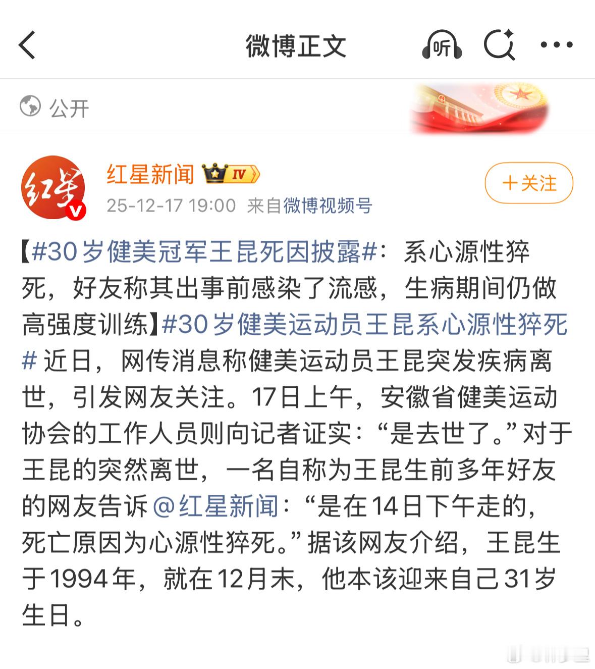 30岁健美冠军王昆死因披露流感期间,仍做高强度训练…感冒发烧期间与康复后,一定时间内别做运动这种常识,为啥总有人不知道。