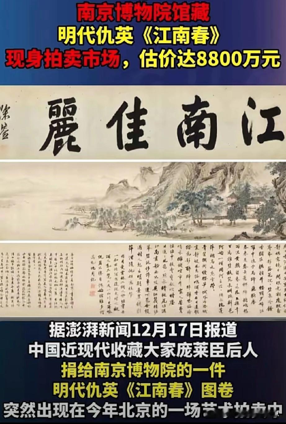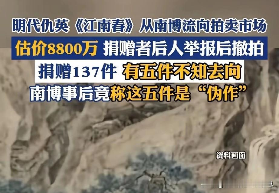 曾经为延续家族文脉,庞家137件传家宝捐赠给了博物馆,但让庞家没想到的是,他们捐赠仇英的《江南春》竟然在拍卖行被估价几千万。 这幅画的捐赠人庞孝常,根本不知道自己这幅画现世,更不知道这幅画正在拍卖行被估价几千万。 要不是有媒体报道,庞家也不知道这幅画在博物馆被“保管”成这样。正因为这件事,可能会让大家对国家机构的信任没了,严重影响今后捐赠的热情。
