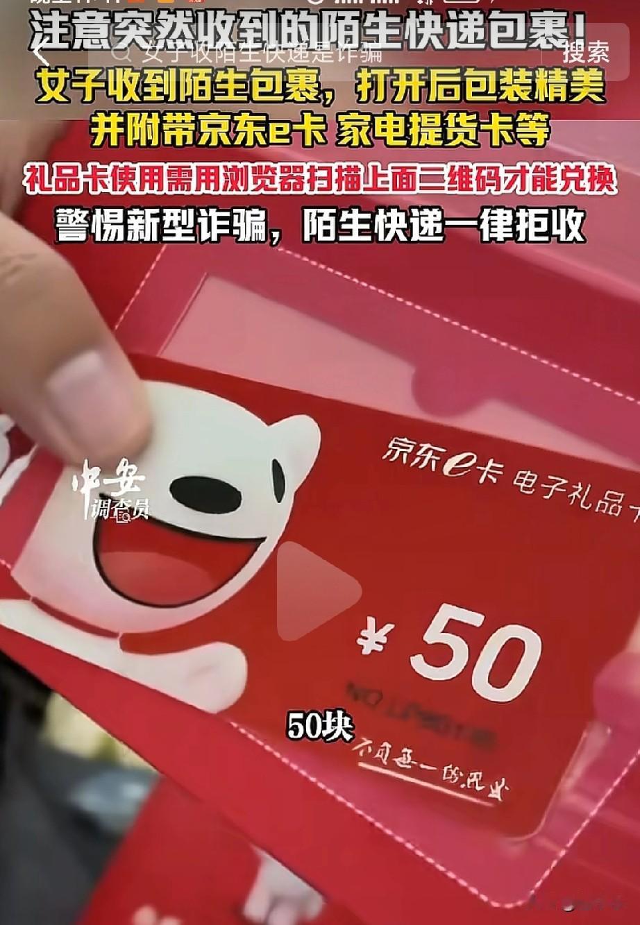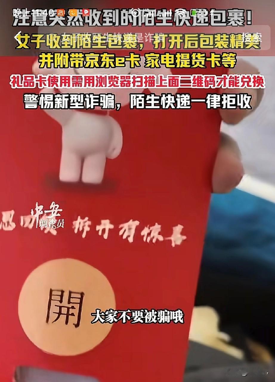 大家一定要警惕起来!四川成都,一女子收到陌生快递包裹,打开包裹后里面礼品很精致,并且附带京东e卡和家电提货卡,但必须要先用手机扫二维码才能领取。网友:为啥我收到的是最差的一个笔记本。 女子并没有网购,反而收到一个快递,这让女子和纳闷了,这是谁在暗恋自己吗?给自己买礼物来了。 打开一看,里面的礼品很精致,一束花和一个小熊挂件,本以为不知是哪个暗恋自己,结果却看到了,有一张京东e卡50元的,还有一张家电提货卡。 不过必须要用手机扫上面的二维码才能提货,否则是提不出来的。 看到这里,女子心里也有数了,典型了新型骗局了。 女子就把这个事情曝光在网上,让大家都能提高警惕。 此事引发热议! 有网友表示, 你遇到的骗子算是下血本了,我收到的不是饭店一次性那种擦手巾,要么就是压线一个。 还有网友表示,你这个还不错了,我收了两次,一次就一个传单,还有一次邮寄过来一个老橙子。 还有网友表示,我也收到过京东的卡,扫码兑换礼品,用的也是我很早之前的网名,山东人从不信天上掉馅饼,接着就扔了。 看来,这样的套路骗局已经传到各地了,大家一定要相信一点,那就是天上不会掉馅饼的,如果真有的话,那肯定就是有陷阱等着你呢……
