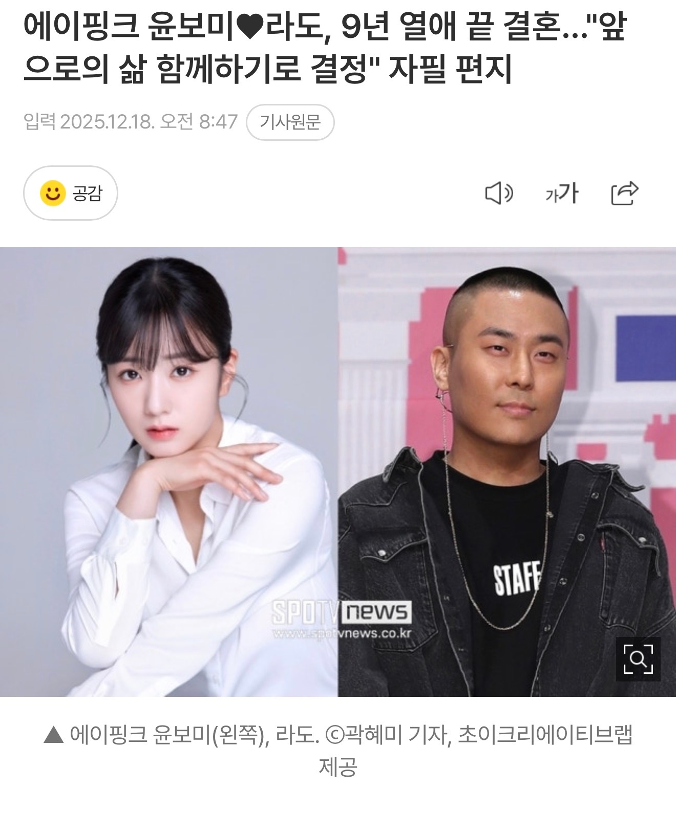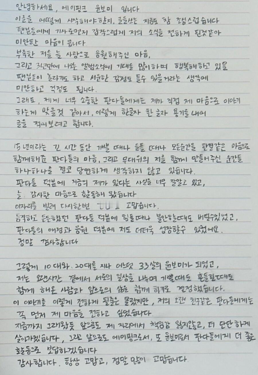 天啊!尹普美也要结婚了!!!!上传了手写信新闻:Apink尹普美与黑眼必胜Rado恋爱九年后官宣结婚~两人在2016年通过Apink正规3辑作为歌手和作曲家结缘,并发展为恋人。 去年承认恋爱并培养了美丽爱情的两人经过9年的热恋终于步入婚姻殿堂。