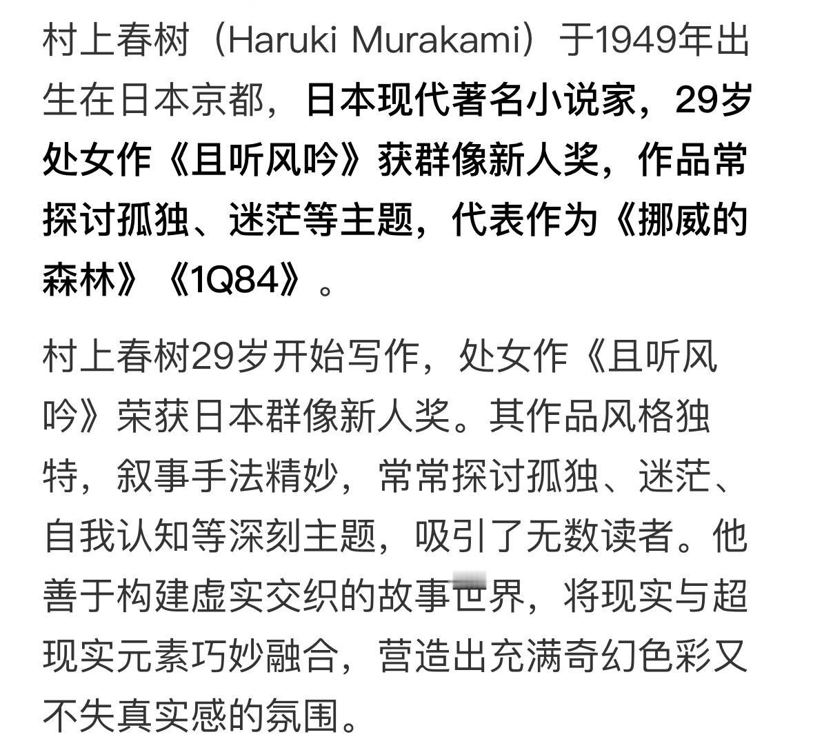 一个日本人有这样深刻的反省,难能可贵,向树上春树老师致敬! 树上椿树的多部作品在全球范围内都产生了深远影响。比如1987年问世的《挪威的森林》,以细腻的笔触描绘了青春期的迷茫与成长、爱情与孤独,深受读者喜爱,成为其代表作之一,在世界范围内畅销,让无数人对书中主角渡边等人的情感经历感同身受。2009年出版的《1Q84》被誉为"新千年日本文学的里程碑之作",构建了一个平行于现实的"1Q84年"世界,情节扣人心弦,引发了读者对人性、社会等诸多方面的深入思考。