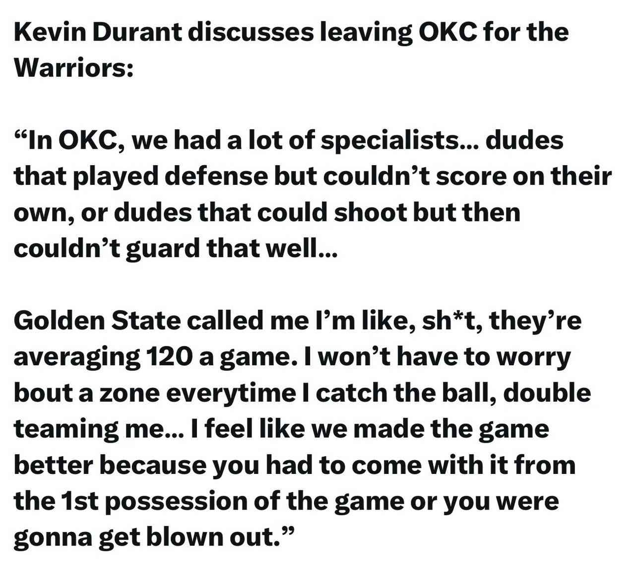 杜兰特谈离开雷霆加盟勇士的原因: “在雷霆时,球队里有很多功能型球员,有的人擅长防守,不能自主得分,有的人能投篮,防守却不太行。 勇士联系我的时候,我心想,好家伙,他们场均能得120分。我再也不用每次接球就面对区域联防、双人包夹了。我觉得我们让比赛变得更精彩了,因为对手从比赛第一回合开始就必须全力以赴,否则马上就会被打花。” Michael Scotto: