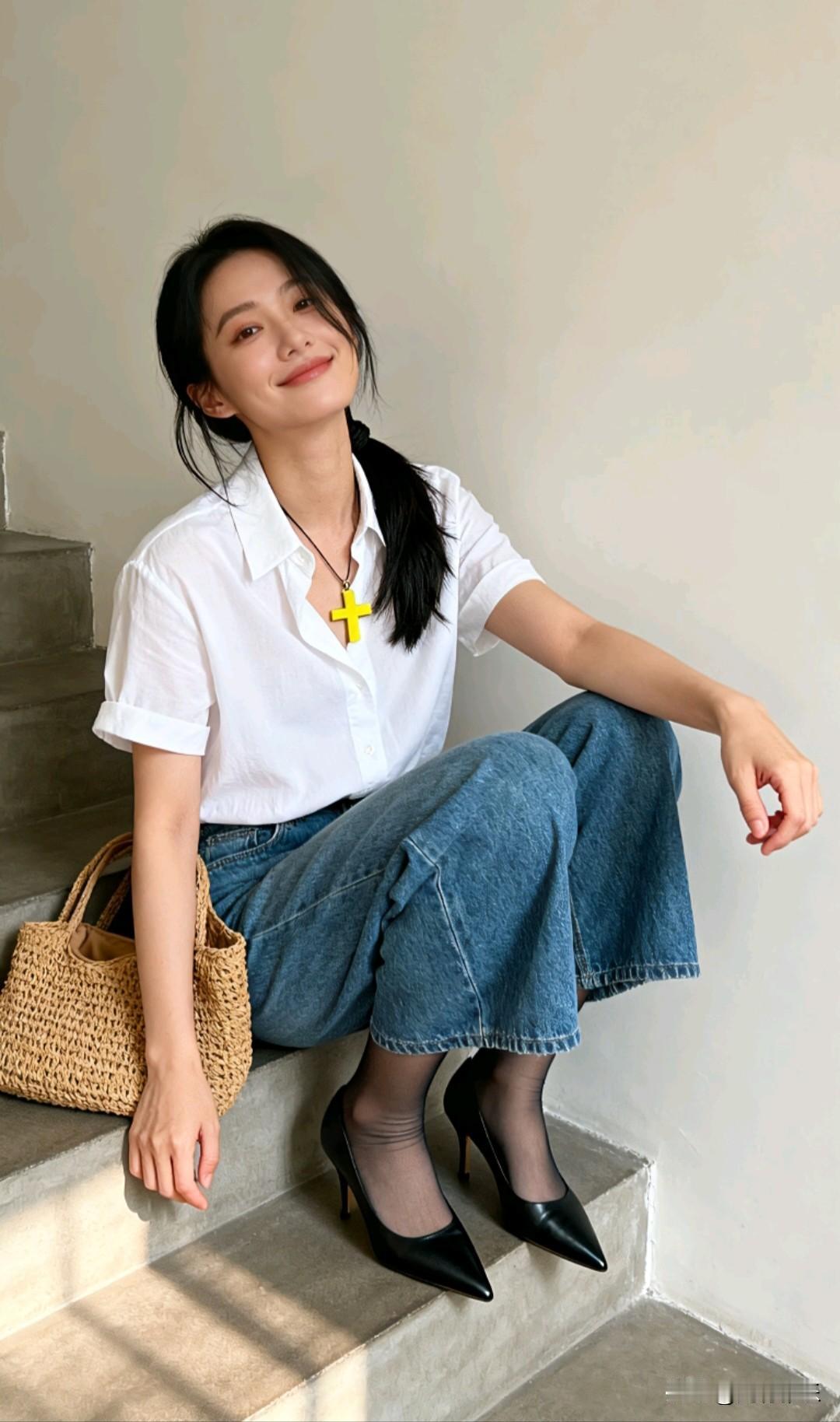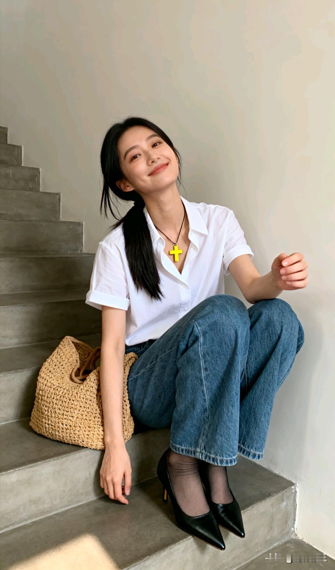 怎样穿搭知性又显身材? 女孩坐在台阶上,穿着休闲又时尚。