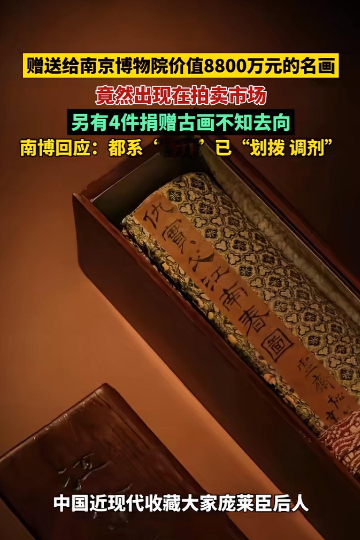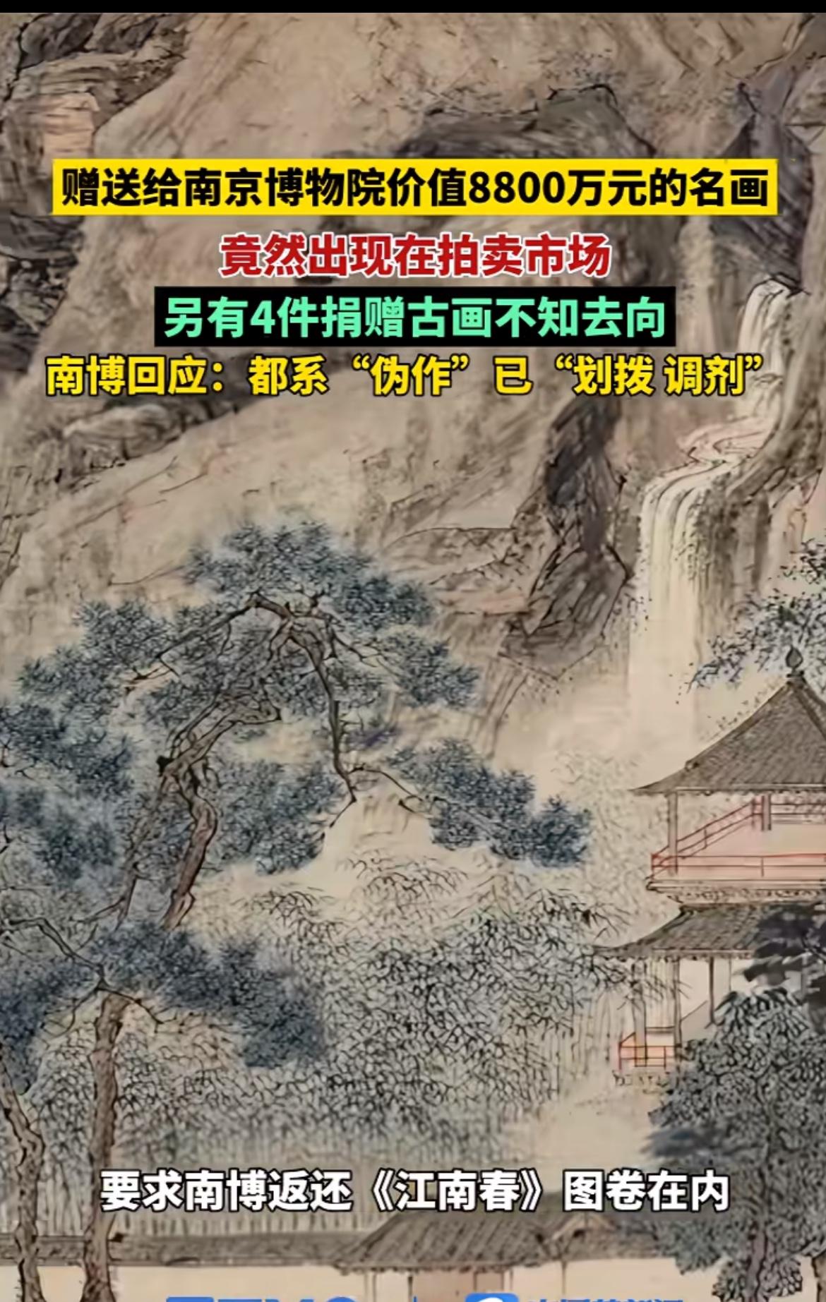 南京博物院这事儿可太有看头了。一幅估价8800万的明代仇英《江南春》图卷现身拍卖市场,引发轩然大波。这画是1959年庞增和捐赠给博物院的。今年5月预展时,庞莱臣曾孙女庞叔令举报,拍卖撤拍。她还起诉要求返还“消失”的捐赠古画。 南京博物院回应,这画和另外4幅争议画作,1961年、1964年两次被专家组鉴定为“伪作”,上世纪90年代按规定处置了。不过拍卖的《江南春》是不是