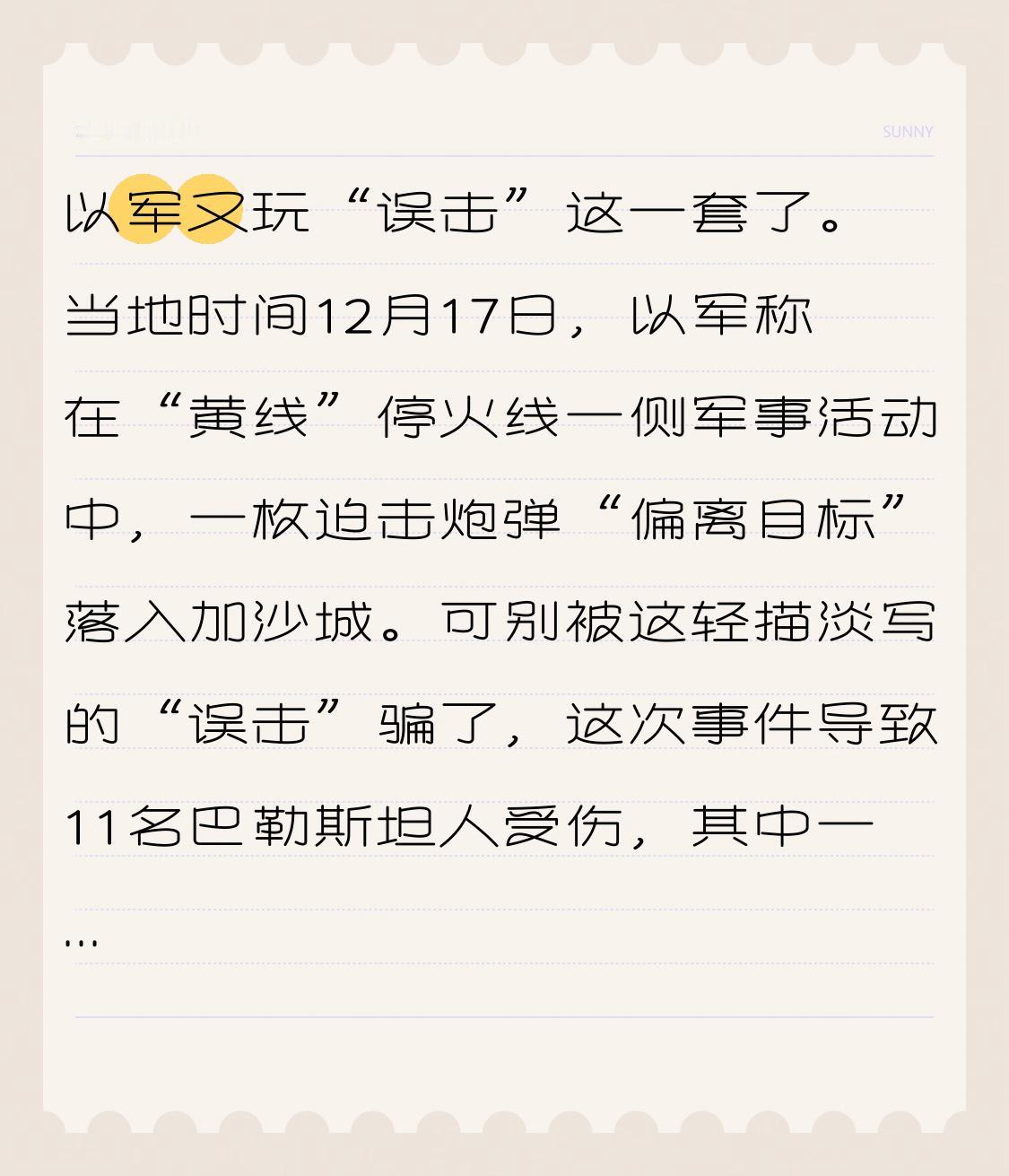 以军又玩“误击”这一套了。当地时间12月17日,以军称在“黄线”停火线一侧军事活动中,一枚迫击炮弹“偏离目标”落入加沙城。可别被这轻描淡写的“误击”骗了,这次事件导致11名巴勒斯坦人受伤,其中一人伤势严重。 据报道,这枚炮弹偏离了约4公里,击中哈马斯控制区。所谓“黄线”,原本有停火协议限制以军行动,但以军总参谋长还称它是“新边界”,还多次射杀越线的巴勒斯坦人。这“误击”到底是意外,还是另有隐情,恐怕只有以军自己清楚了。