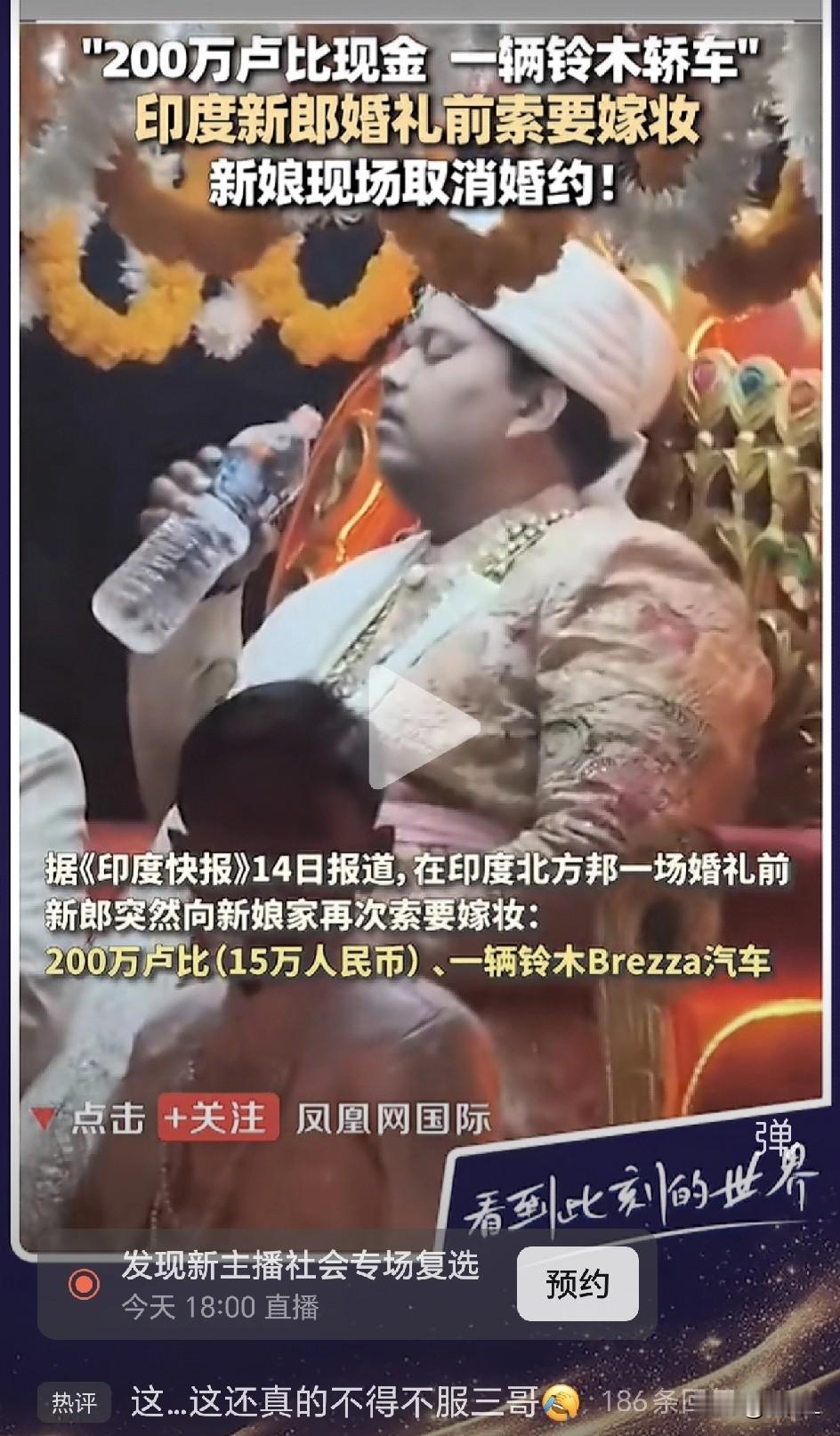 婚礼现场反杀!新郎临时加价200万嫁妆,新娘当场掀了桌子:这婚,我不结了! “戒指收了,项链戴了,50万卢比到手了,现在告诉我还得加钱?!” 2025年12月,印度北方邦一场婚礼现场,新郎临时加价,要求增加嫁妆。 这不是电影剧本,而是真实发生在印度巴雷利市的“婚礼反转剧”。更让人咋舌的是,这已经是新郎家第三次开口要钱了。 “分期付款”式嫁妆:新郎家的“购物清单”越拉越长! 据了解,这场婚姻从一开始就标好了价码: 第一期付款(订婚后):24K纯金戒指一枚 + 金项链一条+现金50万卢比(约3.8万人民币)。 第二期付款(婚礼前):空调、洗衣机、冰箱三大件+全套家用物品+珠宝首饰若干+现金12万卢比。 当女方以为“货款两清”准备办仪式时,新郎家在婚礼现场突然拿出第三期账单:现金200万卢比(约17万人民币)+马鲁蒂铃木Brezza SUV一辆! 这咋前面那些只是首付,现在是尾款了? 婚礼现场瞬间炸锅,新娘当场退婚,并直接报警! 视频里,新娘在事后接受采访时说道,“这个人当着所有宾客的面羞辱了我的父亲和兄弟,我不想嫁给这些贪图嫁妆的人,我不能和这样一个不尊重我父亲的男孩共度一生!” 嫁妆“无底洞”:多少印度女性被榨干最后一滴血? 这出闹剧背后,是印度触目惊心的嫁妆现实。就在这场婚礼前几个月: 2025年8月,北方邦:26岁女子因为拿不出350万卢比+豪车,被丈夫活活烧死。 2025年7月,泰米尔纳德邦:新婚女子在给了丰厚嫁妆后,仍被夫家持续勒索,最终服药自杀。 印度最高法院数据显示,每年至少7000名女性因嫁妆纠纷死亡——相当于每天19条人命。而这只是官方数字,实际可能更多。 事件视频传到网上后,全球网友都坐不住了,神评论: “这是婚姻还是“融资项目”?” “第一次见把‘贪得无厌’演绎得如此理直气壮的!” “建议新郎家下次直接带POS机,支持信用卡分期。” “这不是结婚,这是IPO——首次公开募妻,持续融资,永不退市!” “新娘干得漂亮!止损就要及时,等上市(结婚)后再割肉就晚了!” 更有不少国内网友哭笑不得的调侃: “这…这还真的不得不服三哥!” “所以不管男女一味索要都是不可接受的!” “印度的优良传统是怎么保留下来的???” “阿三要嫁妆比咱们这边要彩礼还猛啊?!” “这么多年把一个儿子养大,耗费了多少心血?再者人家也不是要啥,只是图一个安全感而已!” “新娘委屈的像个中国小伙!” “给这位女士点赞 给国内清醒男士点赞!” “到底是什么让三哥如此一如既往的迷之自信?” 更有细心网友算了一笔账:“金饰+家电+现金62万卢比+200万卢比+SUV≈300万卢比(约26万人民币)。在印度很多地方,这钱够买两套房了!” 值得欣慰的是,越来越多的印度女性开始反抗。巴雷利的这位新娘不是第一个,也不会是最后一个。 “我宁愿当‘退婚女’,也不当‘提款机’。”她在后续采访中说,“嫁妆买不到尊重,只能买到变本加厉。” 法律专家指出,新娘当场报警是教科书式操作。印度《反嫁妆法》规定,索要嫁妆最高可判5年监禁。但长期以来,很多女性因社会压力不敢发声,反而纵容了这种“合法抢劫”。 目前,当地妇女委员会已介入,警方正以“敲诈勒索罪”调查新郎一家。而新娘的勇敢举动,正激励着成千上万印度女性。 婚姻本该是爱情的归宿,而不是财务的捆绑。 当彩礼嫁妆从象征性的礼俗变成明码标价的交易,受伤的不仅是两个家庭,更是整个社会对婚姻的信仰。 这场夭折的婚礼,像一面镜子照出了某些人的贪婪,也照见了一个女孩的勇气。她的转身离开,不是失败,而是胜利——对自己尊严的捍卫,对陈旧陋习的反击。 愿每个奔赴婚姻的人都能被善待,每段婚姻都始于爱情而非算计。 信息来源于凤凰网国际,侵联删!