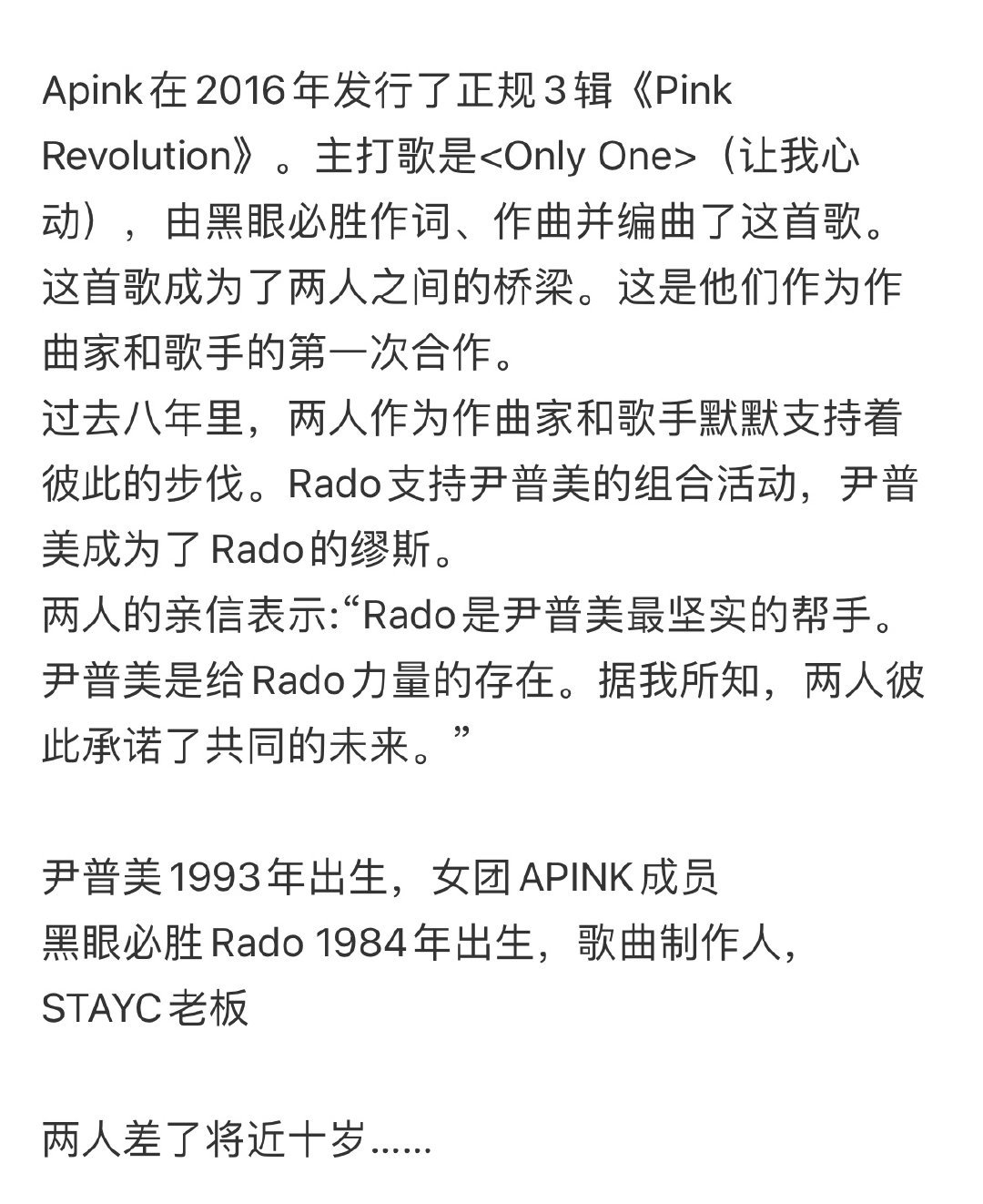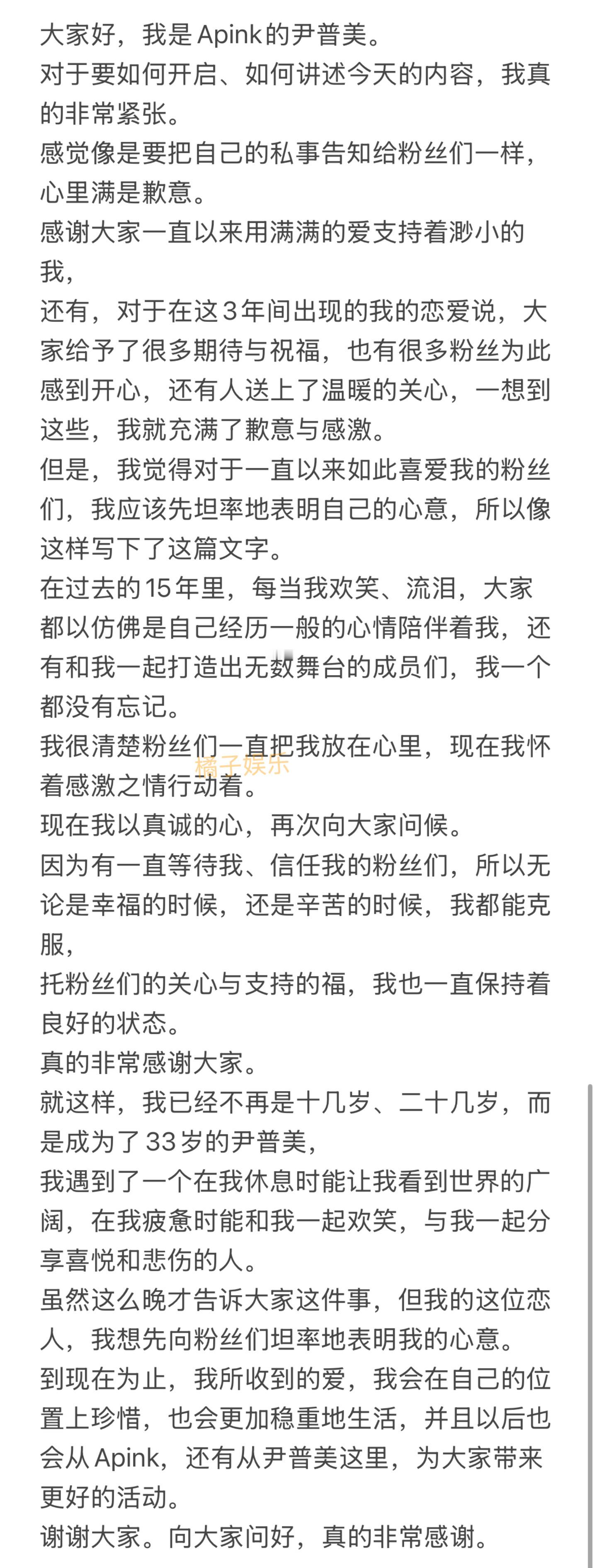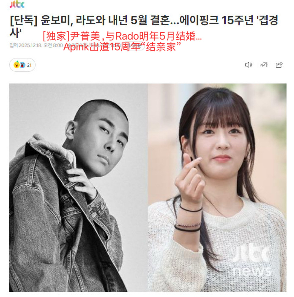 尹普美将于明年5月结婚尹普美发手写信官宣结婚据韩媒报道,Apink尹普美(32岁)和黑眼必胜Rado(41岁)经过9年恋爱,将于明年5月结婚尹普美还发了手写信官宣结婚:“我遇到了一个在我休息时能让我看到世界的广阔,在我疲惫时能和我一起欢笑,与我一起分享喜悦和悲伤的人。”P2-3据悉,两人自2016因音乐结缘,去年4月被D社曝光后承认恋爱,祝福🎉