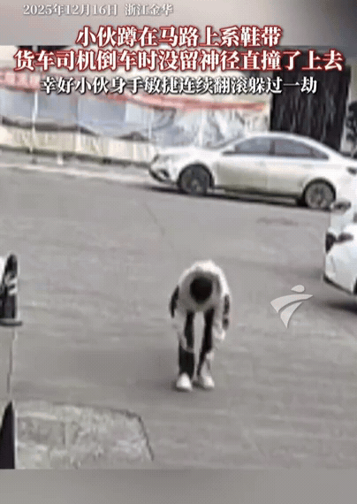 浙江,小伙蹲马路上系鞋带,结果,刚起身,就迎面碰上倒车的货车,小伙瞬间被撞翻,幸好小伙身手敏捷,连续朝后面翻滚2圈躲过一劫,小伙起身后愤怒敲击货车车窗,要不是他反应快,估计就躺在车轮下了,小伙胳膊上、手上有皮外伤,直接选择了报警! 小伙当天出门办事,走着走着觉得鞋带松了,路边刚好宽敞点,他没多想就蹲下去系。哪知道旁边的货车司机要倒车卸货,后视镜根本照不到车后低矮的物体,司机也没下车查看,更没找人指挥,直接凭着感觉往后倒。 小伙刚把鞋带拉紧,下意识起身继续走,结果,一个巨大的车尾朝自己撞来,根本没时间反应,直接被撞翻,小伙赶紧往后方猛滚两圈。货车 “嗖” 地一下擦着他刚才蹲的位置开过去,车轮离他就差半尺远。 司机也吓傻了,赶紧下车查看,二话不说跟着小伙去了交警队,处理这起惊魂未定的事故。 有网友说,蹲在路中间系鞋带,这就是危险行为!把马路当自家客厅? 还有网友说,这种后玻璃完全遮挡的就应该禁止上路!幸好小伙反应迅速,捡回一条命! 看视频里,小伙的位置,刚好处于货车的盲区,货车本身底盘高,后方盲区半径能达到 3 米,像蹲在地上的行人、小孩,还有低矮的电动车,司机从后视镜里完全看不见;要是后窗再被遮挡,盲区范围还得扩大一倍。 《道路交通安全法》明确写着,机动车倒车时,应当察明车后情况,确认安全后再倒车;而行人不得在车行道内坐卧、停留、嬉闹。 对司机来说,尤其是开货车的,盲区就是 “死亡区”,别嫌麻烦,倒车前必须下车绕车一圈检查,或者找专人指挥,哪怕装了倒车影像和雷达,也不能掉以轻心;对行人来说,马路不是自家客厅,系鞋带、捡东西这种小事,多走两步找个人行道台阶、绿化带边缘,就能避开风险,别抱着 “就蹲一分钟没事” 的侥幸心理。 很多人觉得 “我反应快,能躲开”,但小伙的神反应是运气,运气这东西,不可能次次都有。要是他慢半秒,或者货车再快一点,后果不堪设想。 毕竟,生命只有一次,赌不起,也输不起。 你们说,这是谁的责任? 小伙系鞋带被撞神反应躲过一劫