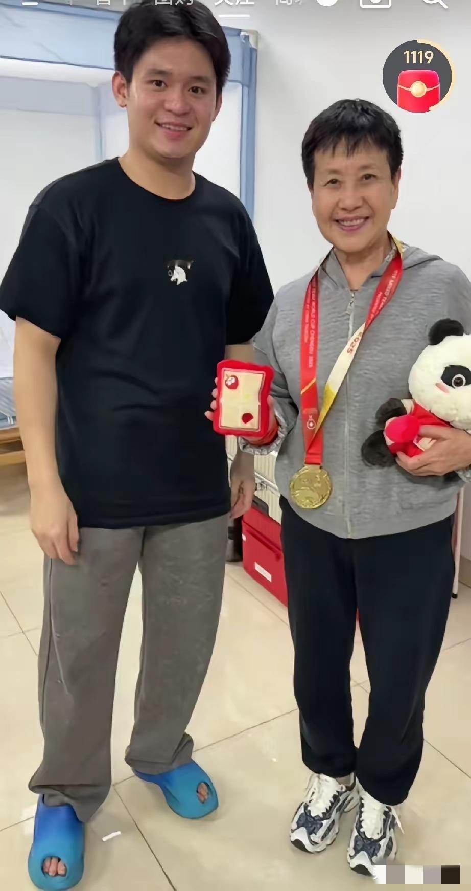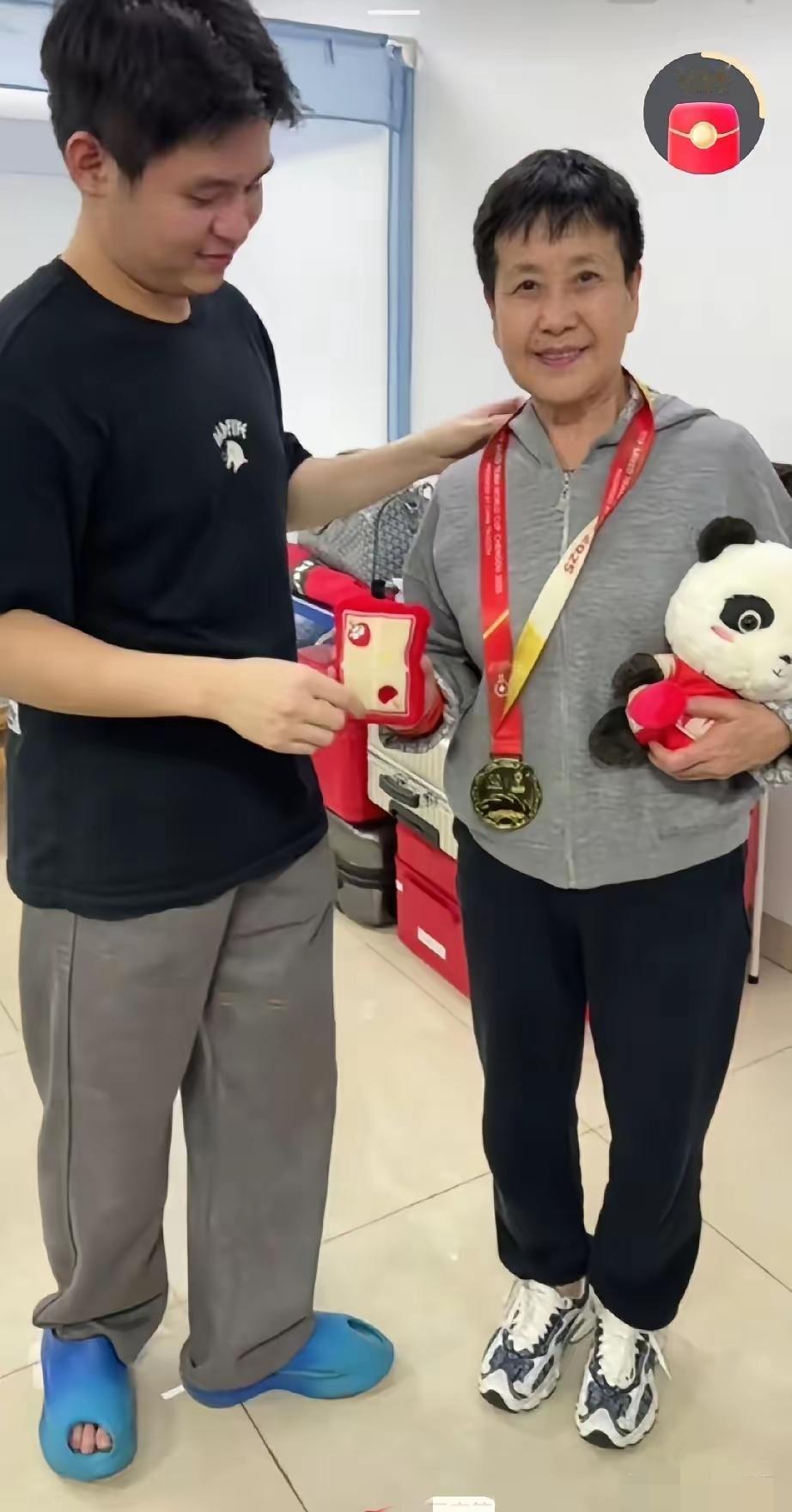 林诗栋真是宝藏男孩,回到海南就去看望恩师,把自己的混团金牌给恩师戴上,还细心的为恩师整理帽子一起合影拍照,从北京到海南,林诗栋也换上了短袖,穿上了凉拖鞋,真不愧是海岛少年啊。(图片来源于网络侵删)