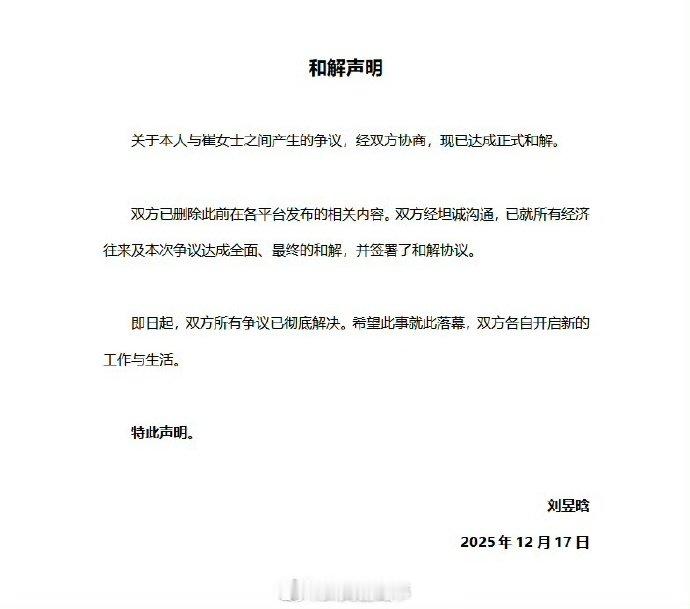 【刘昱晗发和解声明】刘昱晗与前员工和解12月17日晚,发文,称:关于本人与崔女士之间产生的争议,经双方协商,现已达成正式和解。双方已删除此前在各平台发布的相关内容。双方经坦诚沟通,已就所有经济往来及本次争议达成全面,最终的和解,并签署了和解协议。即日起,双方所有争议已彻底解决。希望此事就此落幕,双方各自开启新的工作与生活。此前,刘昱晗前工作人员发文控诉刘昱晗拖欠工资、社保等,引发热议。