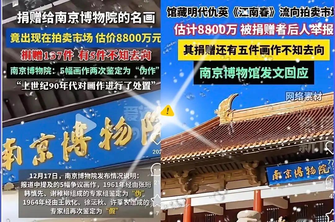 摊上大事了! 南京博物院和庞家较上劲了。 要不是庞家拿出当年捐赠的清单和收据,恐怕南京博物院还要继续瞎扯下去。 1959年庞家捐了137件“虚斋”珍藏,如今少了5件,其中仇英《江南春》竟现身拍卖行估价8800万,这可不是小事。南博说这5件是两次鉴定的“伪作”,上世纪90年代已处置, 这说辞听着就刺耳!庞莱臣“虚斋”藏品号称“江南收藏甲天下”,流传有序的珍品怎么会一次性捐5件伪作?国家文物局早年都将《江南春》列为“非要不可”的征集对象。 2025年12月南博深夜回应,说1961年、1964年两次专家鉴定为假。可庭审时提交的鉴定文件,关键信息全打了马赛克,只露“仇英《江南春》假”几个字。 更离谱的是处置流程。按《博物馆条例》,就算是伪作,也得优先通知捐赠人收回。南博一声不吭就“划拨调剂”,现在连具体去向都讲不清。 庞家后人庞叔令2024年就要求查藏品,南博直接无视。直到起诉胜诉,2025年6月进库房才发现少了5件,除了《江南春》还有赵光辅、王绂等名家之作。