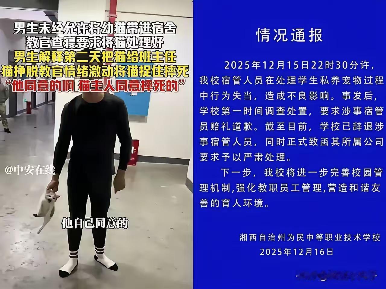 教官摔猫被开除,这结局一点也不意外。他如果摔的是这个嚣张的学生我无话可说,这个学生也必须开除,让他知道什么叫规则! 哪怕这个教官狠揍一顿这个学生,也比无能狂怒摔死一只小猫好得多。 我认为处理不能只处理教官一个人,这个学生更应该处理,这种人更可恨。 脱制服说明什么?脱了等于不是宿管员,已经自我开除了。在学生宿舍闹事属于寻衅滋事,移交派出所判罪。 如果没有这样的教官,那么有这样的学生该如何处理呢?所以有的人必须需要这样的教官。 猫是无辜的,教官脱衣服应该去爆揍挑衅的学生。看过一个电视,一碗米粉能杀死一个人,一只猫能让教官身败名裂。 有本事把那个挑衅的学生揍一顿大家都会为你点赞,可是你却把怒气发泄到了一个弱小的无辜小生命上,这叫无能和怯懦,只会被大家鄙视和唾弃。 视频从头到尾看了,我觉得处理不能只处理教官一个人,这个爆炸头的学生更应该处理,这种人更可恨。 这个视频我看过,那个教官在经过学生多次的挑衅后,终于做出了他认为最正确,最具备血性的决定,摔死了那只猫。