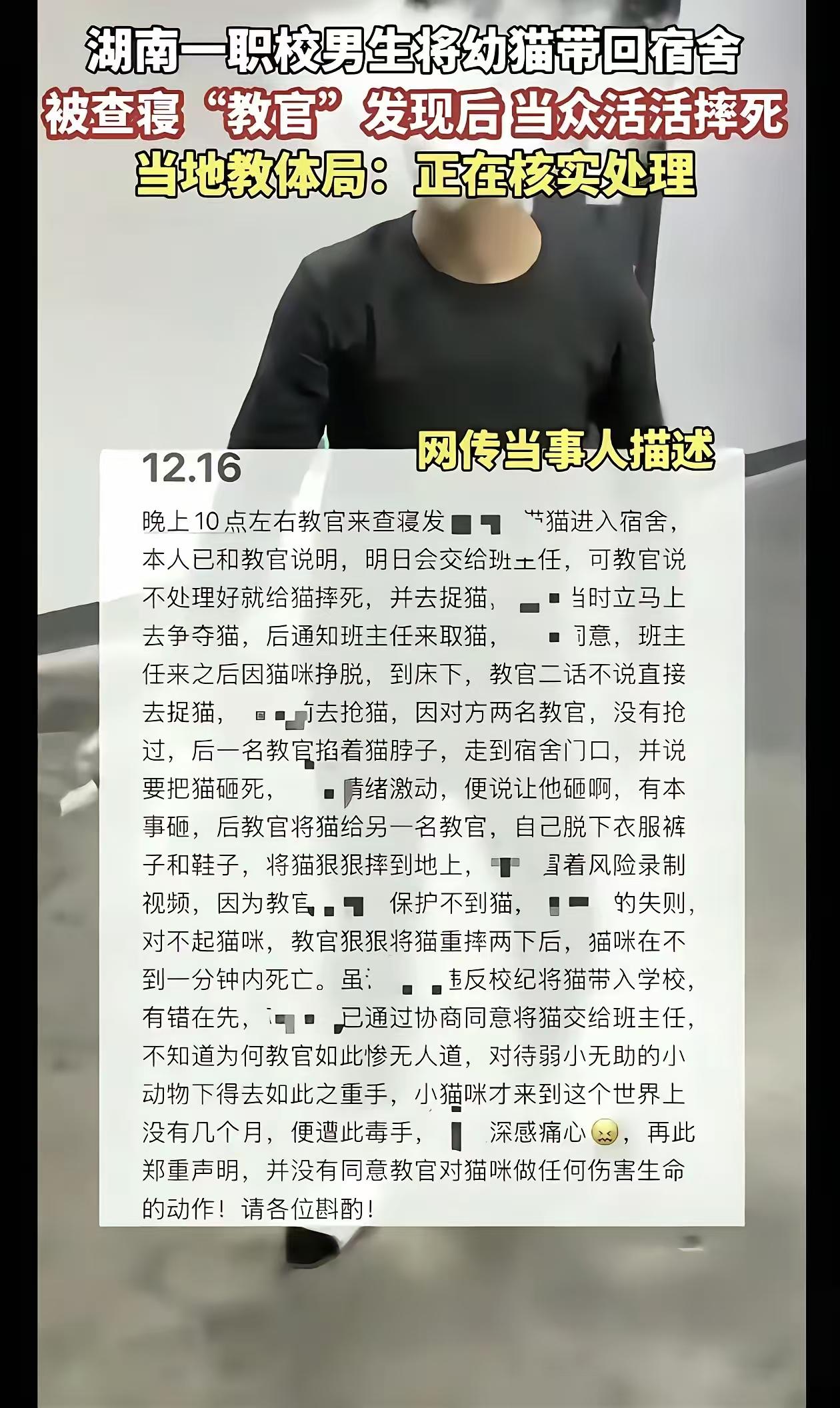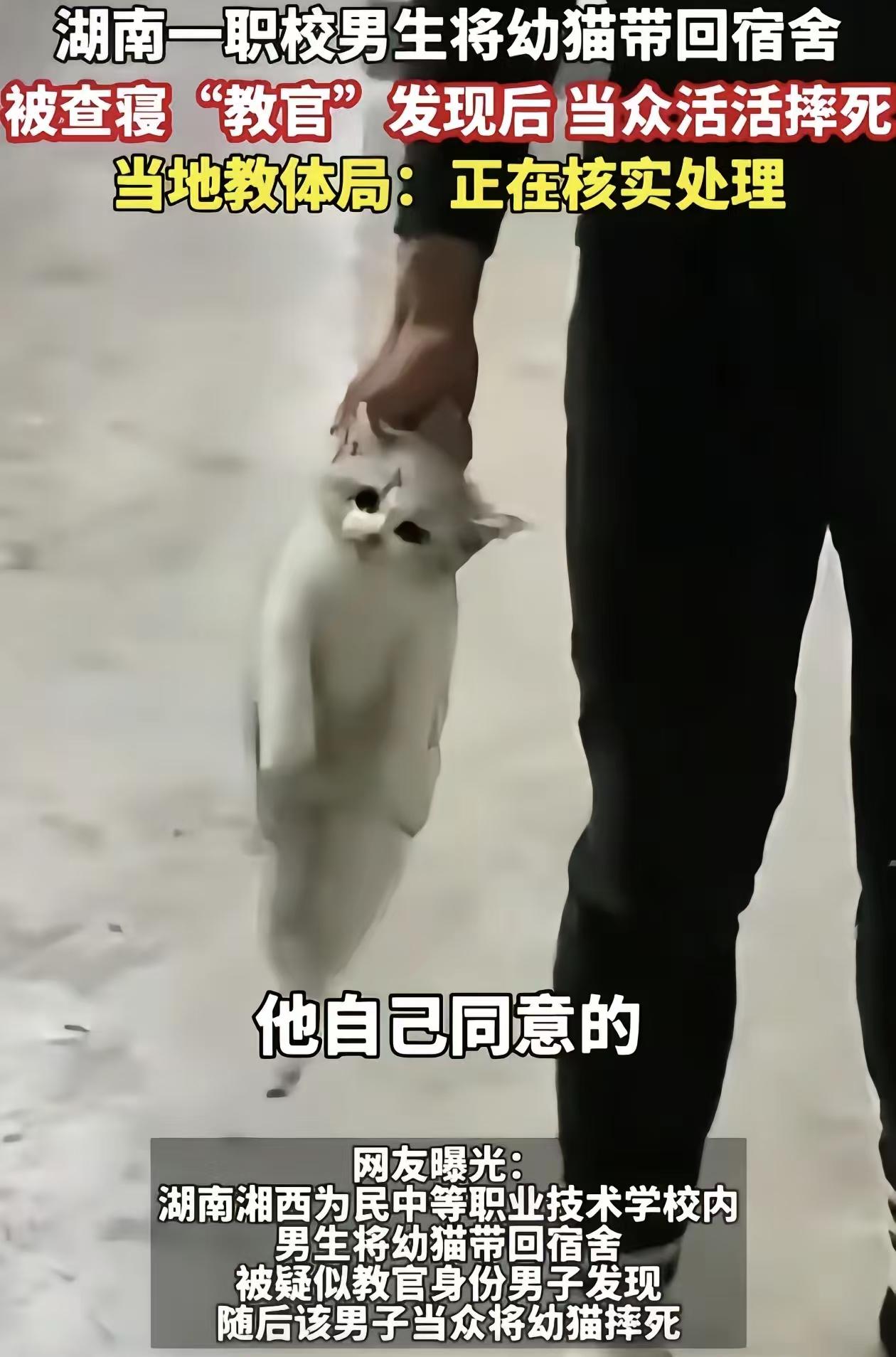 一句“你同意”,就能夺走刚满月小奶猫的命?看了视频,个人觉得这位教官太野蛮,当学生面前摔死一个无辜的幼猫,不配做教官。 毛孩子就是他俩斗气的牺牲品,可怜的毛孩子。 应该反思一下这种聘任教官制度,素质如此低下竟当教官,太可怕了。 学生40次挑衅,然后教官上当,最后学生没事,教官被罚。 在场的人都有责,为什么没人救猫呢?冷漠无情的让人心寒,可怕。 拱火的人必须为他的言行付出代价,换了在社会上这样顶撞拱火,对方捅死他也死的不冤。 看了完整视频,摔猫是在外面,在宿舍内学生一再挑衅,说55次你摔,你摔啊,就是不让带走,另外班主任老师也在劝解后面别养了,学生非得偏不,非得让摔死,出现这一惨状的主要元凶就是这个学生! 没人劝架,教官没台阶下尬住了,被学生不停嘲讽你摔啊,脸上下不来了,但凡有个人劝一下教官也就放手了。 虐杀和践踏无辜生命就是这么随意,这样的教育用任何管理制度做借口都是耍流氓,教不出好的学生,怪不得现在社会戾气如此严重。