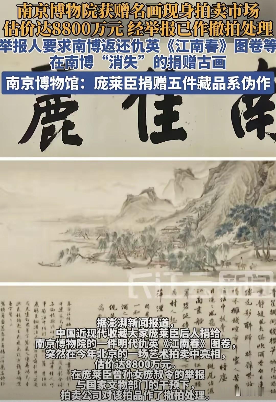 这下好了,脸都被打肿了,南博估计也是做梦都没想到,原本想悄摸的卖件藏品,结果被人家捐赠人的后代拿着证据找上门了!这都过去60多年了,庞家居然还留着当年的捐赠收据保存。 一查才发现,不光这估价8800万的古画在被拍卖还有好几件文物都“不知去向”。 我觉得这事儿根本不是“处置伪作”那么简单,南博说五幅画两次鉴定为假,可关键鉴定材料打满马赛克,连鉴定专家资质都遭质疑,怎么看都透着蹊跷。 庞家1959年无偿捐赠137件珍贵藏品,拿了省政府奖状,如今却要靠打官司查藏品下落,想想都让人心寒。 核心问题出在文物管理的透明化缺失,按规定捐赠文物处置得告知后人,可南博不仅擅自处理,还拿模糊证据搪塞。 这不是单家机构的问题,而是暴露了部分文博单位对捐赠文物的敬畏心不足。 庞家后人维权两年多才推动强制执行,说明捐赠人权益保障机制还有漏洞。 这件事的本质是公信力的考验,文博单位手握公共文化资源,却不能公开透明管理,只会让捐赠者寒心。 8800万的古画撤拍后,其余四件文物仍无下落,南博的回应避重就轻,很难让人信服。 希望这次能彻底查清去向,补上管理漏洞,不然以后谁还愿意把传家珍宝捐给国家?庞博博博文微博 南博美术馆 南博看展 南博新展 南博大咖 国博文物鉴宝 南博创意园
