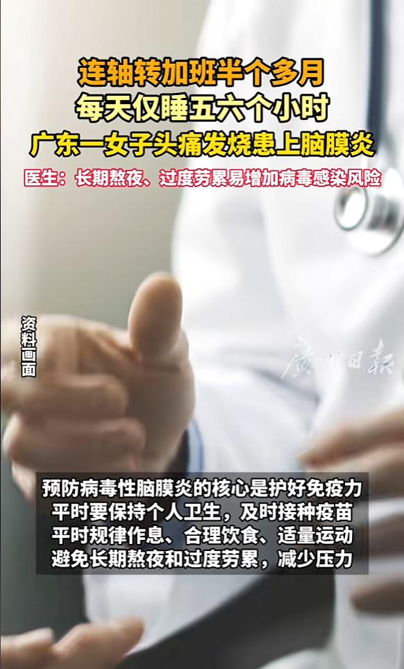 “悲剧还是发生了!”近日,广东深圳,一女子因工作忙碌,连轴加了半个月班,每天只能睡五六个小时,某天早上起床后,她突发头痛,还发烧了,以为只是普通感冒,但吃了药后症状反而加重,去医院最终被确诊为脑膜炎。网友:拿健康换工作! 这位女子平时工作就挺拼的,前段时间手上接了个紧急项目,为了赶进度直接开启了 “连轴转” 模式。整整半个月的时间里,睡眠对她来说成了奢侈的事,每天忙完工作只能挤出来五六个小时闭眼休息,有时候甚至忙到后半夜,天不亮又得爬起来接着干。 身边人劝她别这么熬,身体会吃不消,可她总觉得自己年轻,精力旺盛,咬咬牙就能扛过去,没把这些提醒放在心上,一门心思扑在项目上。 直到某天早上,她像往常一样起床准备去上班,刚坐起来就感觉一阵剧烈的头痛袭来,脑袋昏沉得厉害,摸了摸额头,还发烫发烧了,这种症状太常见了,她当时没多想,只以为是最近熬夜多、着凉了,患上了普通感冒。 于是随手找了家里的感冒药,吃了两片就匆匆出门了,心里还惦记着当天要完成的工作任务,压根没把这 “小感冒” 当回事,可让她没想到的是,这次的 “感冒” 远比想象中凶险。 吃了感冒药后,不仅头痛发烧的症状没缓解,反而越来越严重,到了下午她开始恶心呕吐,一开始还只是轻微反胃,后来直接变成了喷射性呕吐,整个人也变得蔫蔫的,一点精神都没有,连站都站不稳,根本没法继续工作,这时候她才意识到不对劲,之前的侥幸心理彻底没了,只剩下恐慌。 家人看到她这副模样也急坏了,赶紧放下手里的事,开车把她送进了医院,医生接诊后,经过一系列细致的检查,最终给出的诊断结果让所有人都吓了一跳,病毒性脑膜炎。 这个结果让女子和家人都懵了,好好的怎么就得了脑膜炎?医生解释说,这都是长期熬夜、过度劳累惹的祸,她连续半个月睡眠不足,身体的免疫力早就降到了低谷,就像一道没了防守的城墙,病毒很容易就趁虚而入,攻击了中枢神经系统,才引发了脑膜炎。 医生还说幸好送医及时,要是再晚一点,病毒进一步侵蚀大脑,后果不堪设想,可能会留下严重的后遗症,甚至危及生命,现在女子还在医院接受治疗,慢慢康复中,但这场病也让她彻底明白了健康的重要性。 半个月的拼命加班,换来的不是项目完成后的荣耀,而是一张住院通知单,身体遭罪不说,还得耽误后续的工作和生活,怎么算都是一笔亏本的买卖。 这件事传到网上后,网友们议论纷纷,不少人都感同身受,有网友说:“现在职场人太难了,不拼不行,可拼着拼着就把身体拼垮了,真不知道该怎么办才好。” 还有网友直言:“拿健康换工作就是最傻的选择,工作没了可以再找,健康没了就什么都没了。” 更多的人是在提醒身边人,千万不要过度透支自己,熬夜加班要适可而止,身体发出的任何信号都不能忽视。 其实很多职场人都有过类似的经历,总觉得年轻能扛,把熬夜加班当成努力的证明,却忘了身体的承受能力是有限的,普通的头痛发烧,可能只是身体在提醒你该休息了,但如果长期忽视,就可能酿成无法挽回的后果。 就像这位深圳女子,以为只是小感冒,没想到是脑膜炎的预警,希望她的经历能给大家提个醒,工作再重要,也比不上健康,好好睡觉、规律作息,不是老生常谈,而是保护自己的根本。千万别等悲剧发生了,才后悔当初没有好好爱自己。 (信息来源:《连轴转加班半个多月,每天仅睡五六个小时,广东一女子头痛发烧患上脑膜炎医生: 长期熬夜、过度劳累易增加病毒感染风险》广州日报)