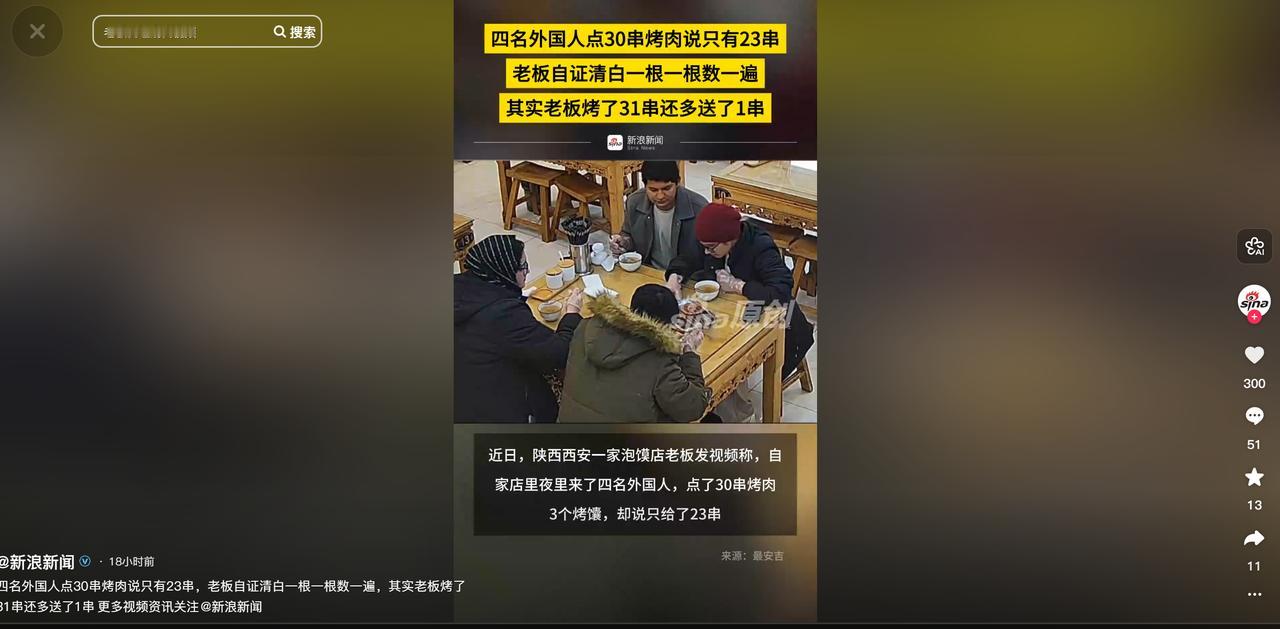陕西西安,一家泡馍店老板发视频称,自家店里晚上来了四名外国人,点了30串烤肉和3个烤馕,结果上菜后,四人却说只给了23串烤串。为此老板觉得不可能,因为他是清清楚楚数好了才上桌的,而且不是30串,而是31串,也就是多送了他们一串。老板为了自证清白,便来到四人桌前,一根一根的数给他们看,数完也是干脆的把多了那一根烤串给拿走了。 陕西西安的宵夜江湖里,最近出了件挺有意思的事儿,一家泡馍店老板发了段视频,分享了自己遇到的离谱经历,晚上店里来了四位外国食客,点了 30 串烤肉和 3 个烤馕,结果东西刚上齐没多久,这四位就提出了质疑,说店家只给了 23 串烤串,少上了 7 串。 这事儿让老板又纳闷又有点委屈,直言根本不可能,因为每一串都是他亲手数清楚才上桌的,而且实际给的还不是 30 串,而是 31 串,特意多送了一串,就是怕计数有误差,没成想反倒被说少上了。 熟悉这家店的老顾客都知道,老板做生意特别实在,尤其是卖烤肉的时候,还有个不成文的习惯,只要顾客点了烤肉,后厨都会多烤一串送过去。 老板觉得人工计数难免会有疏忽,多送一串既能避免可能出现的差错,也能让顾客觉得实惠,算是一份小小的心意,所以这次四位外国食客点了 30 串,老板特意烤了 31 串,仔仔细细数了一遍,确认没错才让服务员端上桌,怎么也没想到会被说少了 7 串,这差距也太大了。 面对四位食客的坚持,老板没有急着争辩,只是觉得又好气又好笑,他跟对方解释自己多送了一串,实际是 31 串,但对方似乎并不相信,依旧坚持说只看到 23 串,老板想着空口无凭,与其口舌之争,不如直接用事实说话,于是干脆走到四人的餐桌前,准备当着他们的面数一遍,自证清白。 当时桌上的烤肉还冒着热气,签子堆在一起,老板也不顾盘子油腻,直接拿起签子,一根一根地挑出来,一边数一边把签子摆整齐,周围的食客也被这一幕吸引,纷纷看了过来,只见老板手指捏着签子,动作干脆利落,数得又快又准,清脆的数数声在热闹的店里都能听清。 随着数字一个个往上加,很快就超过了四位食客说的 23 串,接着又越过了原本点的 30 串,最后稳稳地停在了 31 串上,数完之后老板也没多废话,当着四位食客的面,干脆利落地把多送的那第 31 串烤肉抽了出来,直接拿走了。 老板觉得,自己多送串是出于善意,可对方无端质疑自己缺斤短两,这份善意也就没必要再保留了,严格按单子上菜,没毛病,这段视频被老板发到网上后,很快就引发了网友们的热议,大家都觉得这事儿又离谱又好笑。 有网友调侃说:“这数学水平也太让人意外了,31 串能数成 23 串,差了 8 串都没察觉,这可不是一点点误差啊!” 还有人觉得老板做得特别解气:“本来就是好心多送一串,结果被冤枉少上,换成谁都得不舒服,老板当面数清楚再拿走多送的,既自证了清白,又没激化矛盾,处理得太到位了。” 也有网友代入了老板的视角,觉得遇到这种事儿挺糟心:“做生意最讲究诚信,老板本来就没少给,还多送了结果被无端质疑,换谁心里都得堵得慌,还好老板有耐心当面数清楚,要是没耐心的,说不定直接就吵起来了。” 还有些网友看热闹不嫌事大,开玩笑说:“这四位的数学要是考试,估计得不及格吧,下次再吃烤肉,不如先把手指头数明白再开口,免得闹这种笑话。” 其实老板后来也说,当时也没想着要怎么样,就是不想被冤枉,毕竟自己做生意一直实实在在,从不缺斤短两,多送一串也是为了让顾客满意,这次当着大家的面数串,也是想证明自己的清白,拿走多送的那串,就是想让对方知道,善意是相互的,不能理所当然地质疑别人的诚信。 这件事虽然是个小插曲,但也让不少人觉得挺有感触,做生意讲究诚信,顾客也该多一份信任,遇到问题好好沟通,没必要一上来就质疑对方。 而老板的处理方式,既没丢面子,又没让事情闹大,还保留了体面,算是给大家上了一课,希望以后不管是商家还是食客,遇到问题都能冷静沟通,少一点无端的质疑,多一点相互理解,这样不管是吃饭还是做生意,都会舒心很多。