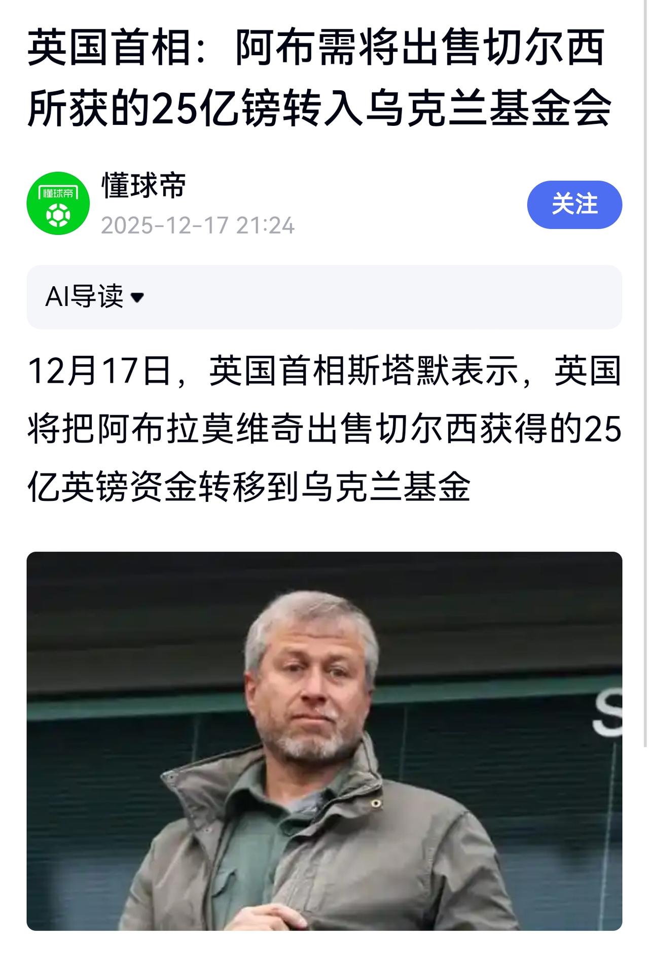 “风可进雨可进,国王不能进。私人财产神圣不可侵犯!”与契约精神正沦为笑话。 据12月17日《卫报》报道,英国首相斯塔默声称,如果阿布拉莫维奇不将出售切尔西足球俱乐部所得的25亿英镑移交乌克兰,将被起诉! 这就是他们所谓的契约精神,也是所谓私人财产不可侵犯的法律精神。 俄乌战争是国家行为,却拿私人开刀。 从2022年拉布被强制卖出切尔西,并被要求所得款项需要援助乌克兰的受害者,到如今更是要求把所有款项交给乌克兰。这与强盗有何区别? 不知道大家如何看待英国这一政府行为呢?合法合理吗?私人财产还能被保护吗?