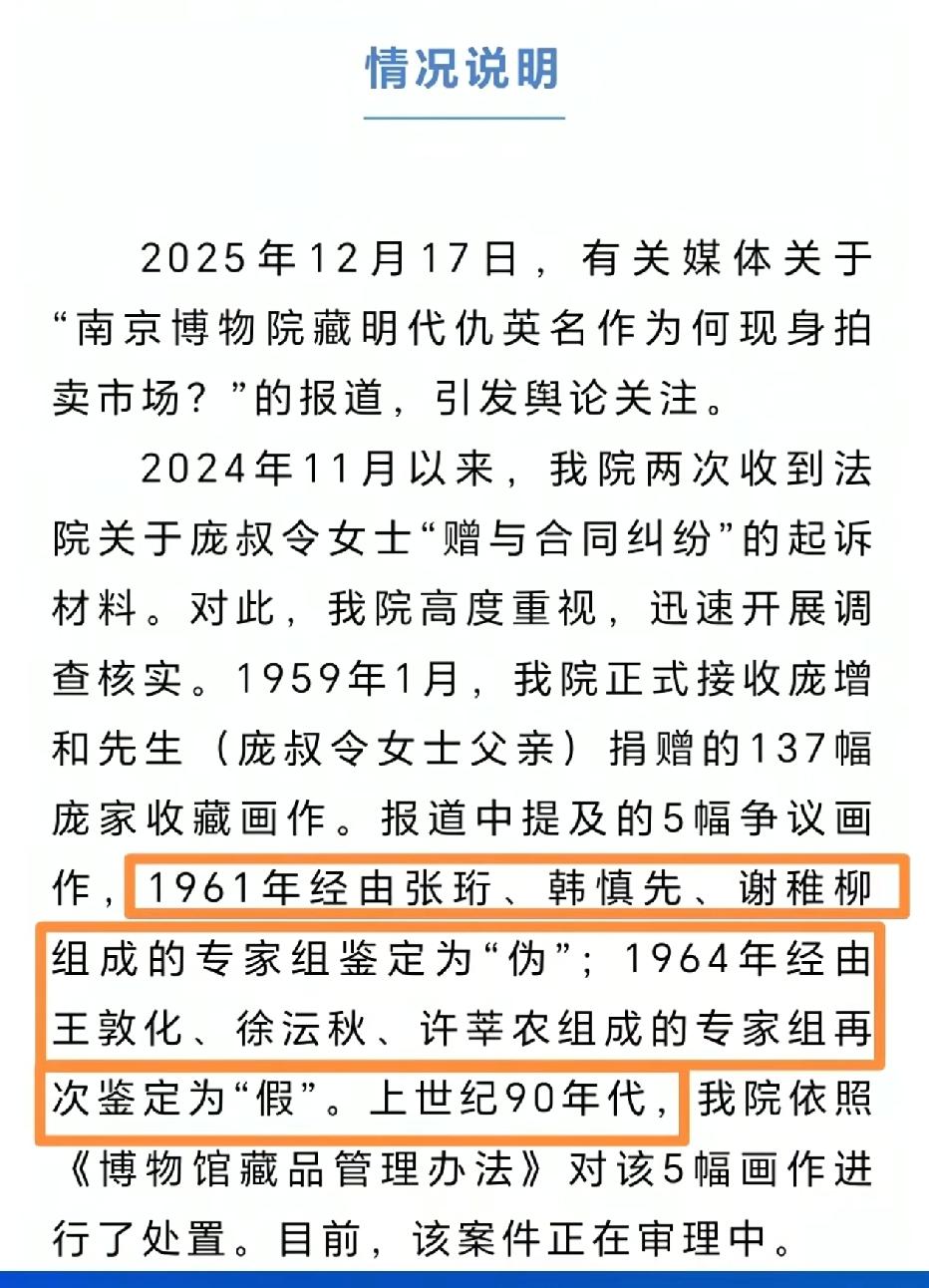 南京博物院历任院长: 第一任院长:蔡元培 1933年 第二任院长:傅斯年 1933年4月-1934年7月 第三任院长:李济 1934年7月-1947年5月 第四任院长:杭立武 1947年5月-1949年4月 第五任院长:徐平羽 1950年3月-1956年1月 第六任院长:曾昭燏 1956年1月-1964年12月 第七任院长:姚迁 1964年12月-1984年11月 第八任院长:梁白泉 1986年10月-1998年11月 第九任院长:徐湖平 2001年2月-2005年12月 第十任院长:龚良 2005年12-至今 按理讲,南京博物院藏品出现在拍卖会,根据南京博物院的回复时间点,1961,1964,90年代三个时间点,三任经手院长(六,七,八)都离世了,如果南京博物院记录不详,确实非常难调查清楚。
