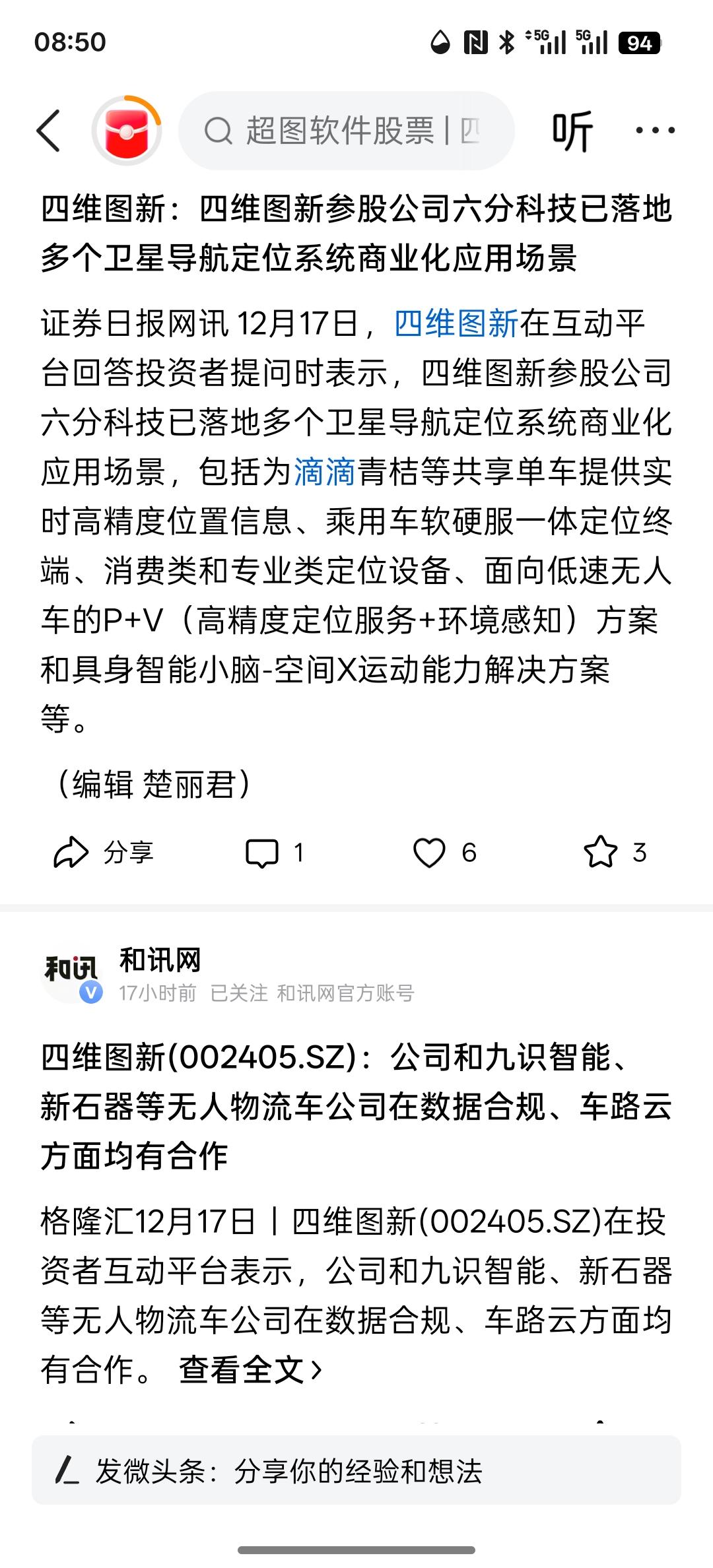 四维图新:四维图新参股公司六分科技已落地多个卫星导航定位系统商业化应用场景,最近有多项合作,与华为有合作与北汽有合作,包括在车规,芯片,智能机器人AI人工智能也是全方位的发展!在车规级芯片,智能驾驶方面与北汽长安有合作。 在智能机器人方面的发展也收购了相关公司的股份,可谓是全方位的发展布局!在车路云一体发展方向,更是在多个城市布局发展!主要发展方向符合国家十五五规划的战略目标! 当前主要发展的方向就是人形机器人,包括汽车的智能驾驶技术以及科技AI人工智能! 中国科技发展依然会分享更多的红利,释放给市场!更多的企业能够培育出更多的科技成果!
