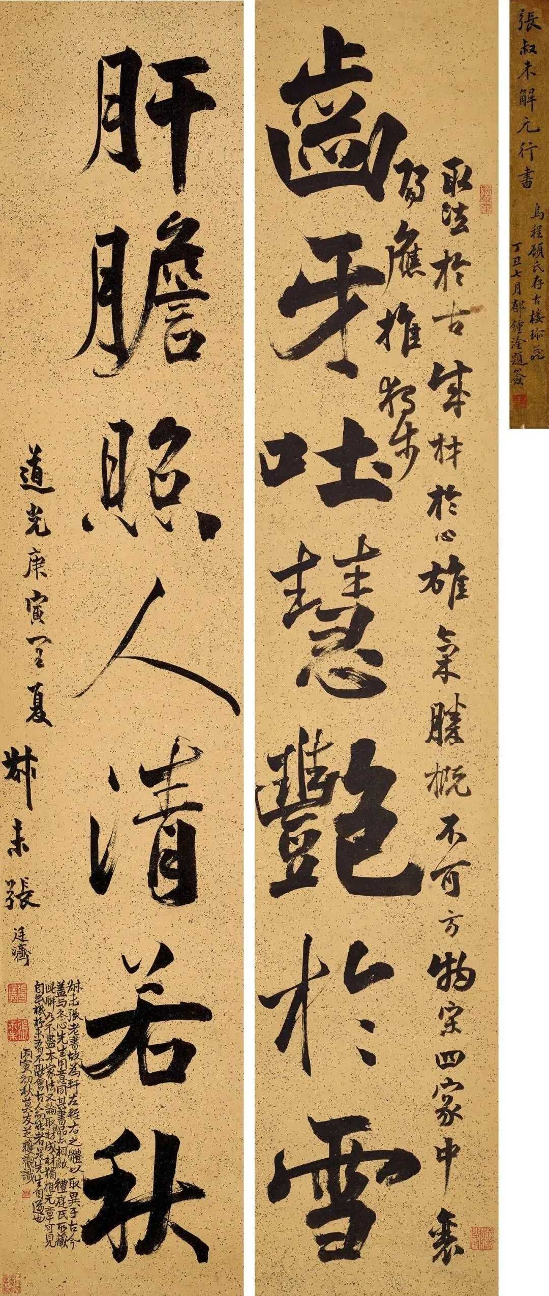 张廷济 行书《齿牙肝胆七言联》,镜心 水墨纸本 124×24 cm×2。释 文:齿牙吐慧艳于雪;肝胆照人清若秋。张廷济(1768年-1848年),字顺安,号叔未,浙江嘉兴新篁人,清代金石学家、书法家。清嘉庆三年(1798年)乡试解元,后屡试不第,遂潜心金石收藏与研究。这就是中国风遇见艺术