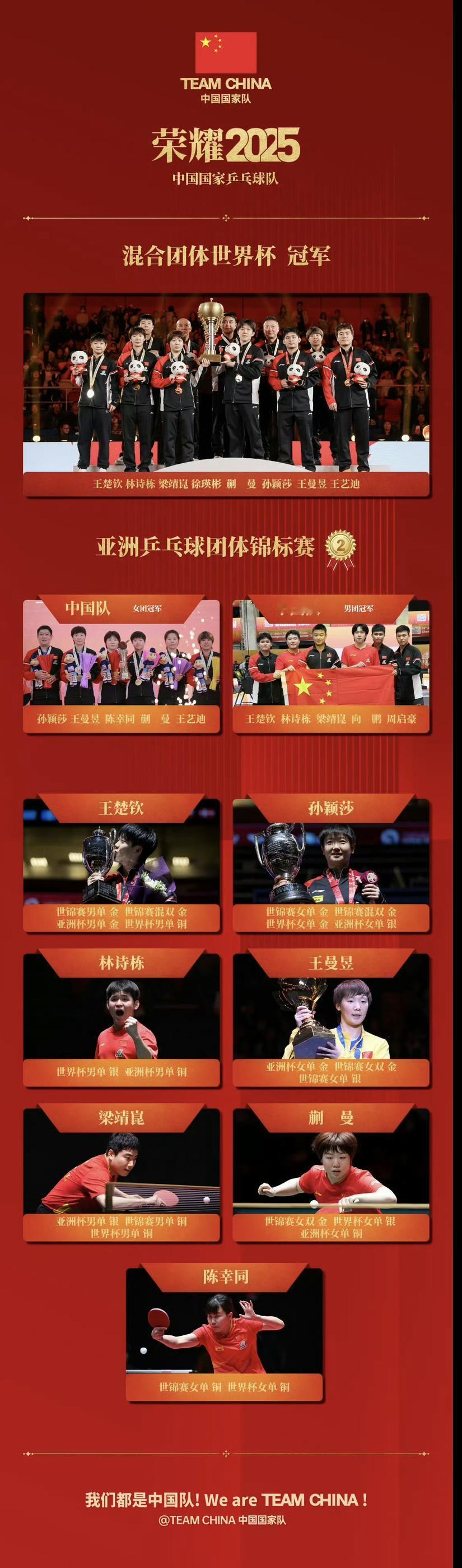 国乒年底盘点:女乒主力阵容“呼之欲出”,男乒仍然“扑朔迷离”! 从目前国乒公布的 2025 荣誉榜,我们可以看出, 女乒在过去的一年,没有丢失任何三大赛冠军,而 4 名球员都有 3 大赛荣誉。排在前三的是孙颖莎,王曼昱,蒯曼,这和混团世界杯的主力一致。也就是孙颖莎,王曼昱,蒯曼坐稳主力,陈幸同和王艺迪争夺 p 卡。 而男队的情况,却让人有点略显沉重,过去一年得三大赛荣誉,国乒丢失世界杯冠军和世锦赛男双冠军2个重量级冠军,3大赛只有王楚钦,林诗栋,梁靖崑三人上榜,这意味着国乒主力就是这三人,在樊振东没有回来的前提下,第四人仍然找不着,而梁靖崑下半年的状态下滑,又让这主力阵容“扑朔迷离”。