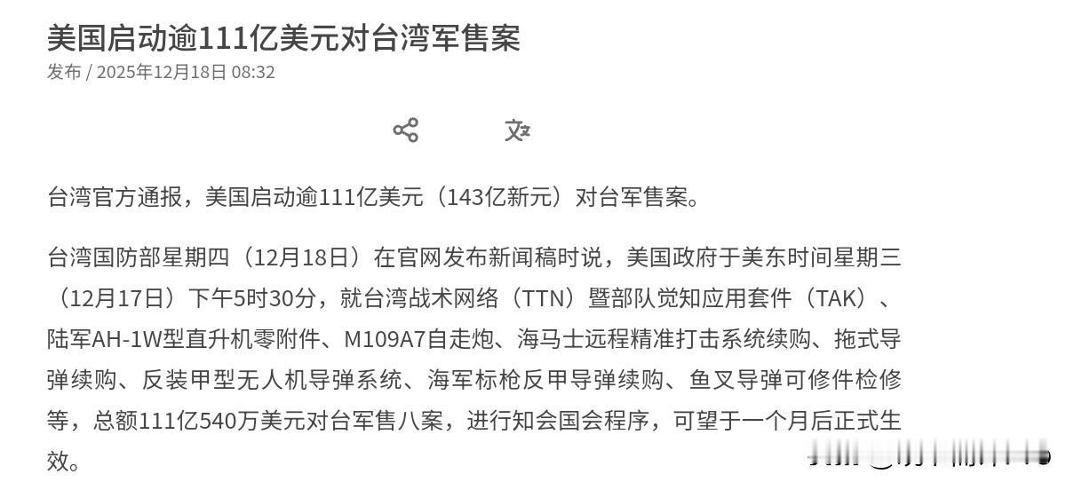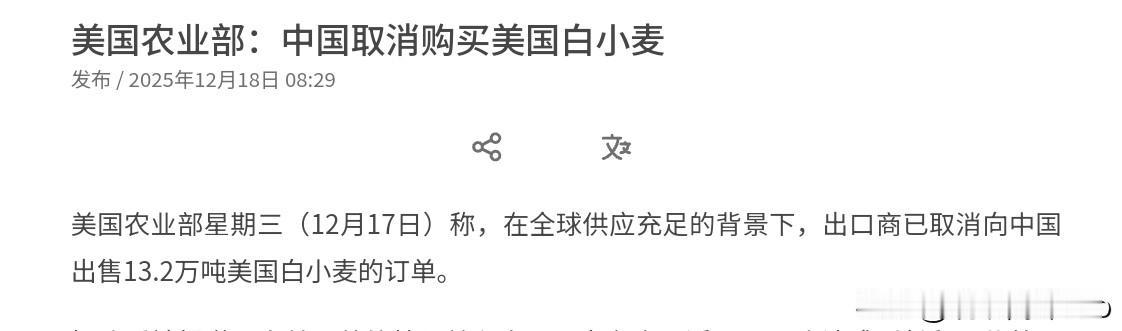 美国又想挑事,中国取消美国的订单!若美国没有意识到事态的严重性,弄不好我们会有更大动作!12月18日,根据外媒报道,中美关系刚趋于稳定之后,美国又在台湾问题上做文章了。外媒称,美国将启动逾111亿美元对台军售案。这一军售案销售的军品包括M109A7自走炮、海马士远程精准打击系统续购、拖式导弹续购、反装甲型无人机导弹系统、海军标枪反甲导弹续购、鱼叉导弹等等。 很显然,美国的这一军售行为,金额极大,这对于我们是极大的挑衅,这将严重冲击中美关系。不过,就在外媒传出这一消息之际,美国农业部却突然曝光了一个消息,美国农业部表示,在中国一年多来首次采购美国小麦之后,中国采购商突然宣布取消了一笔13.2万吨美国白小麦的订单。很显然,两个消息出现的时间点如此巧合,恐怕并不是偶然。 事实上,中美通过谈判,两国关系好不容易稳定下来,而在此基础上,我们恢复了对美国农产品的采购。而现在美国又意欲在台湾问题上做文章,在对华关系上开倒车,我们的这一取消订单的行为,更像是在对美国的警告,也就是提醒美国在台湾问题上必须谨言慎行。 如果美国不顾我们的警告,不排除我们会出台更强力的反制措施,而取消对美农产品采购可能只是一方面,强化稀土管制,甚至举行大规模围台军演,都极有可能是我们考虑的选项。很显然,对待美国,我们有充足的准备,在台湾问题上我们绝对没有让步的空间。